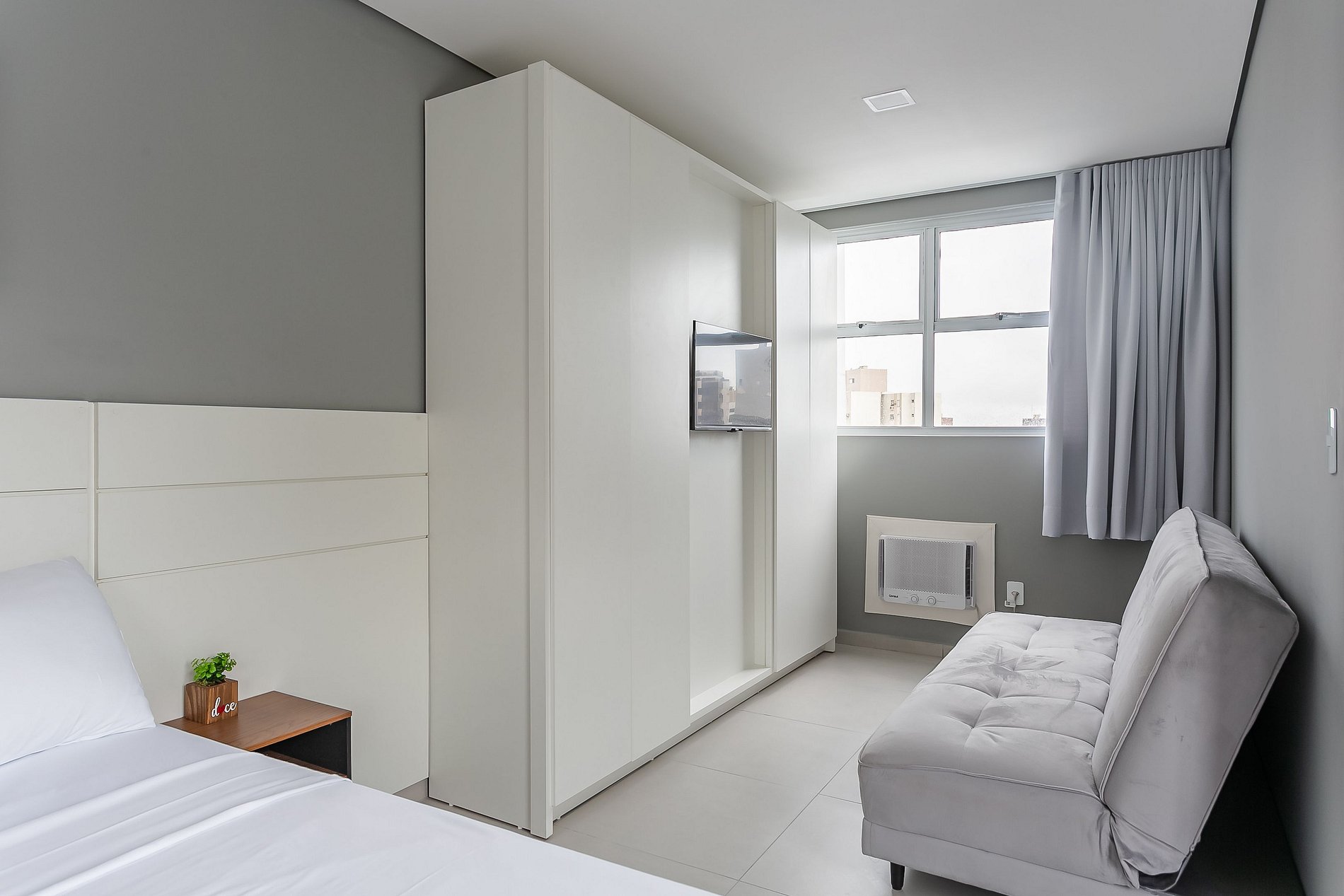 The 50m2 studio has a KING bed, a SINGLE sofa bed, Smart TV and SPLIT AC.