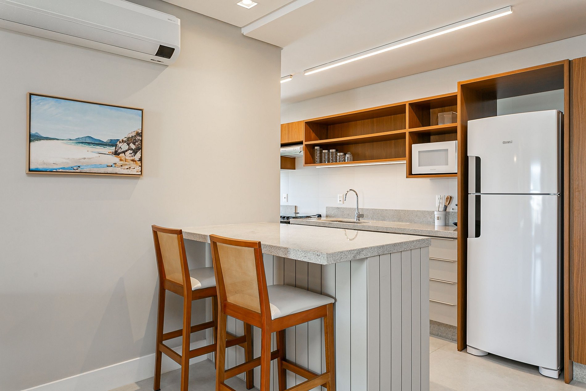 The 92.81m² property has two suites, a living room with Smart TV and a balcony with barbecue. All rooms are equipped with split air conditioning.