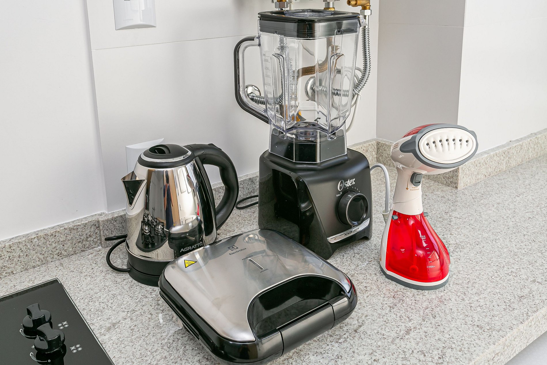 - Full kitchen with coffee maker, refrigerator with freezer, blender, sandwich maker, kitchen utensils, and cookware set