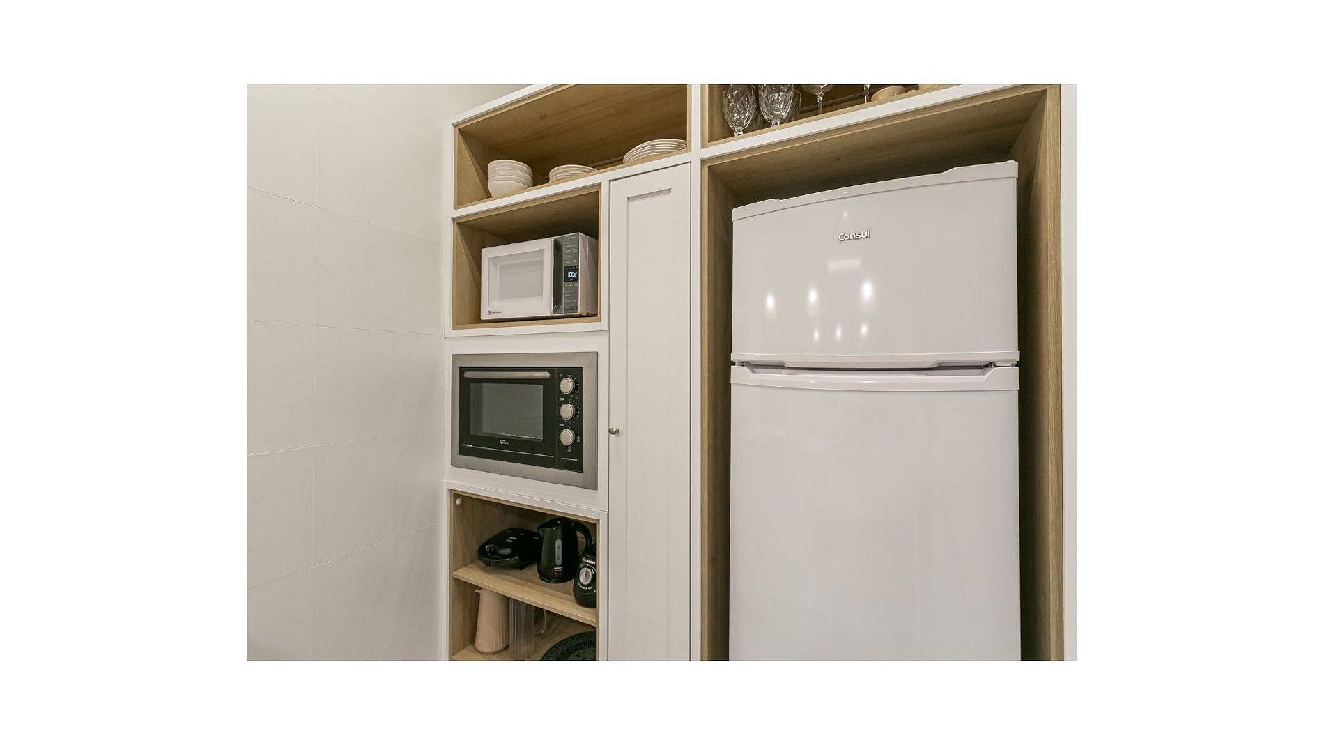 - Complete kitchen with coffee maker, electric kettle with adjustable temperature, refrigerator, blender, sandwich maker, kitchen utensils, and cookware set.