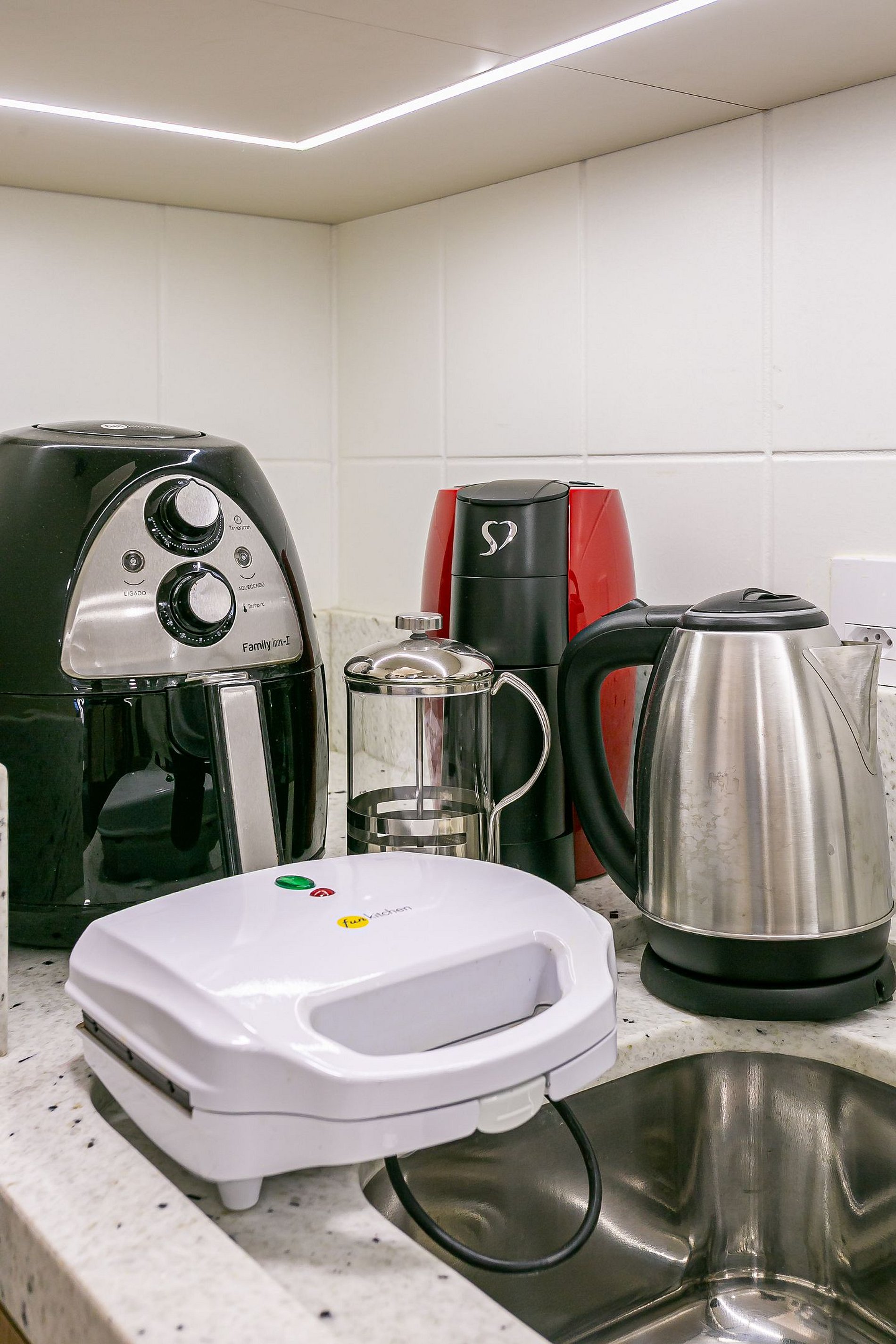 Complete kitchen with coffee maker, refrigerator with freezer, blender, microwave, sandwich maker, kitchen utensils, and cookware