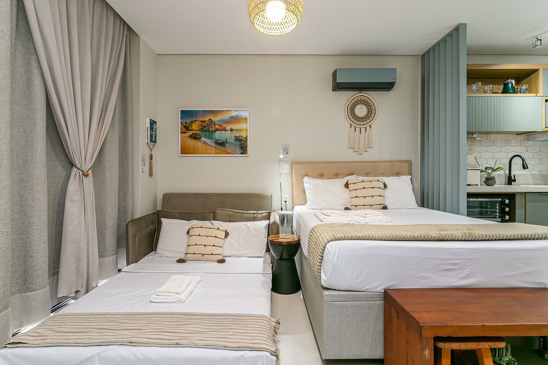 The 34 m² property features a queen-size bed, 43" Smart TV, and split air conditioning (hot and cold).