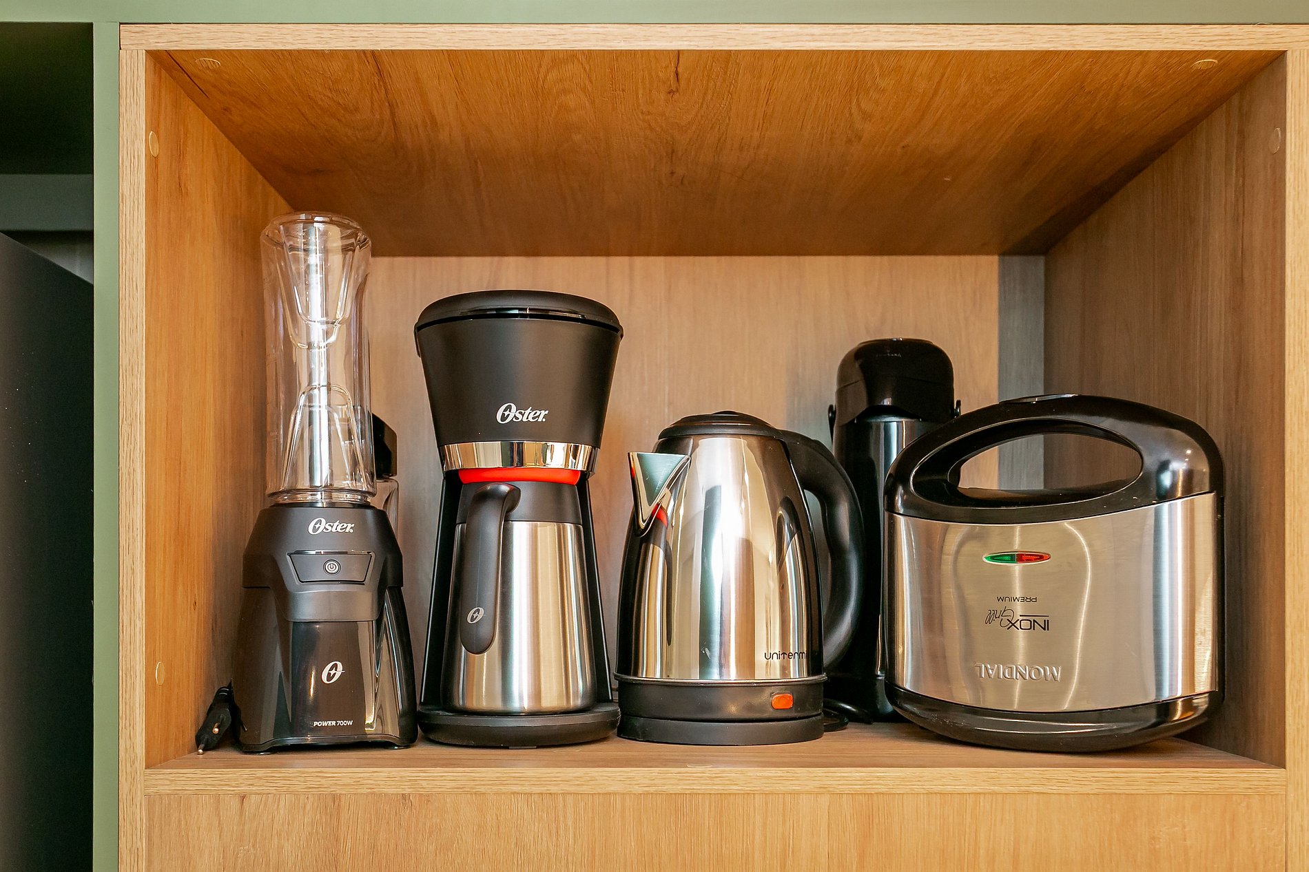- A complete kitchen with a coffee maker, refrigerator with freezer, blender, sandwich press, cookware, and kitchen utensils