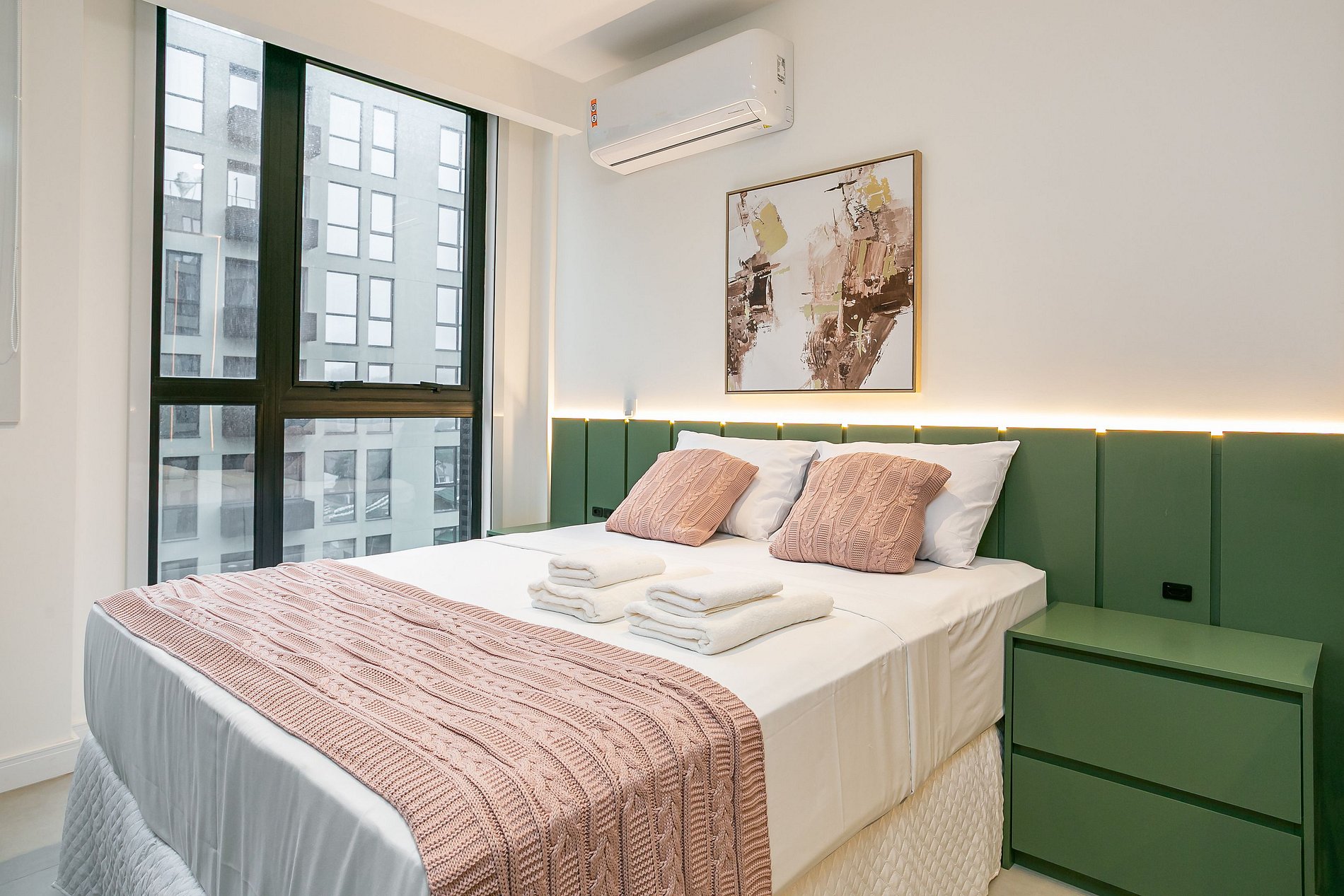 The 31.17 m² unit features a QUEEN-SIZE BED, a 43" SMART TV, and a SPLIT AIR CONDITIONER (HEATING AND COOLING).