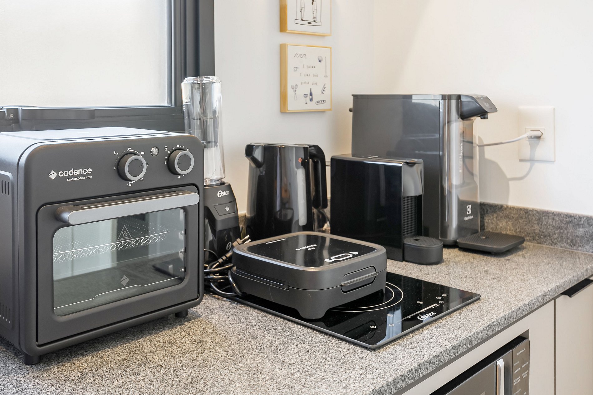 - Fully equipped kitchen with coffee maker, fridge with freezer, blender, microwave, sandwich maker, cookware set, and kitchen utensils