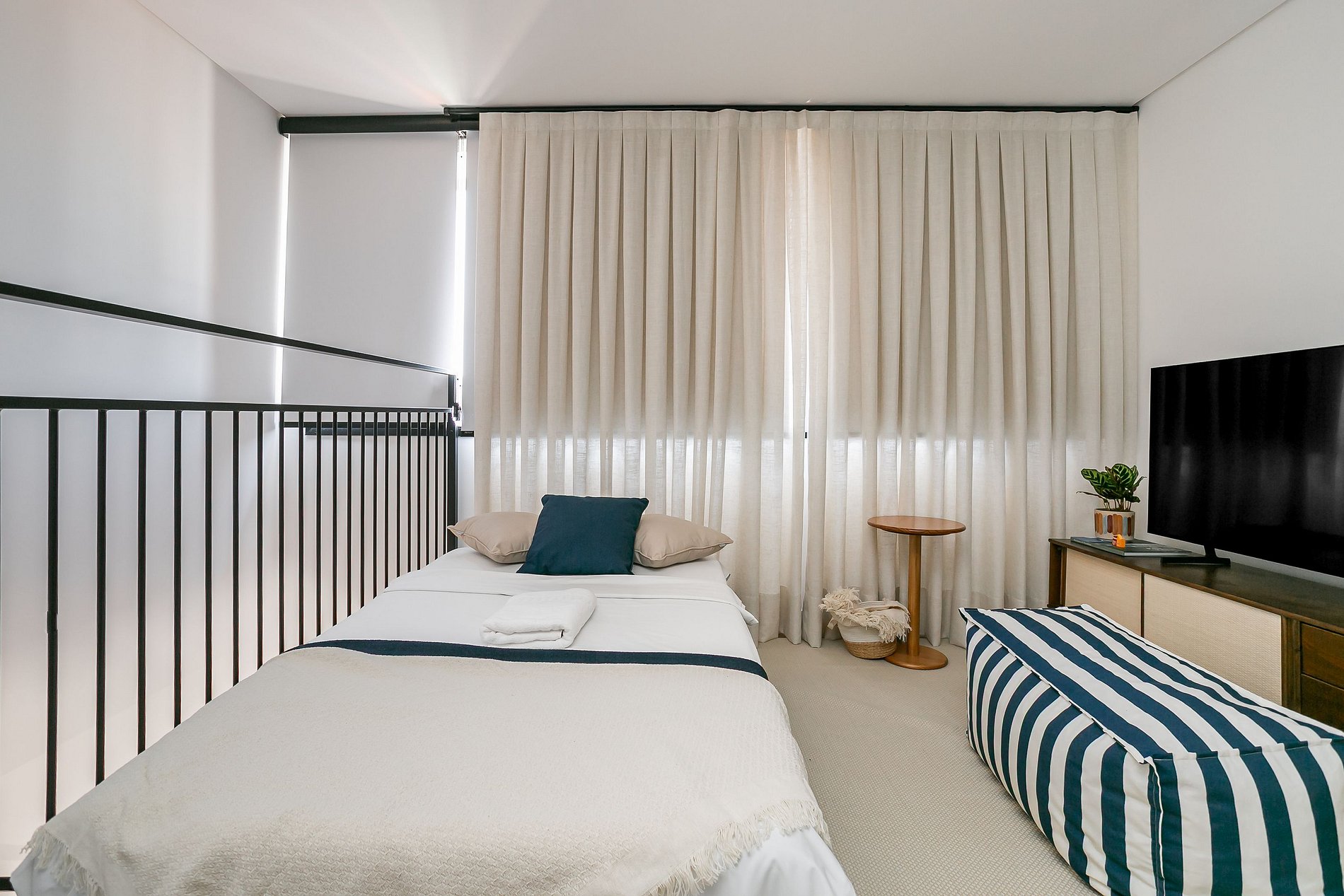 This 42 m² studio features a double bed, a single sofa bed, and a 50" Smart TV. It also includes a split air conditioner (hot & cold).