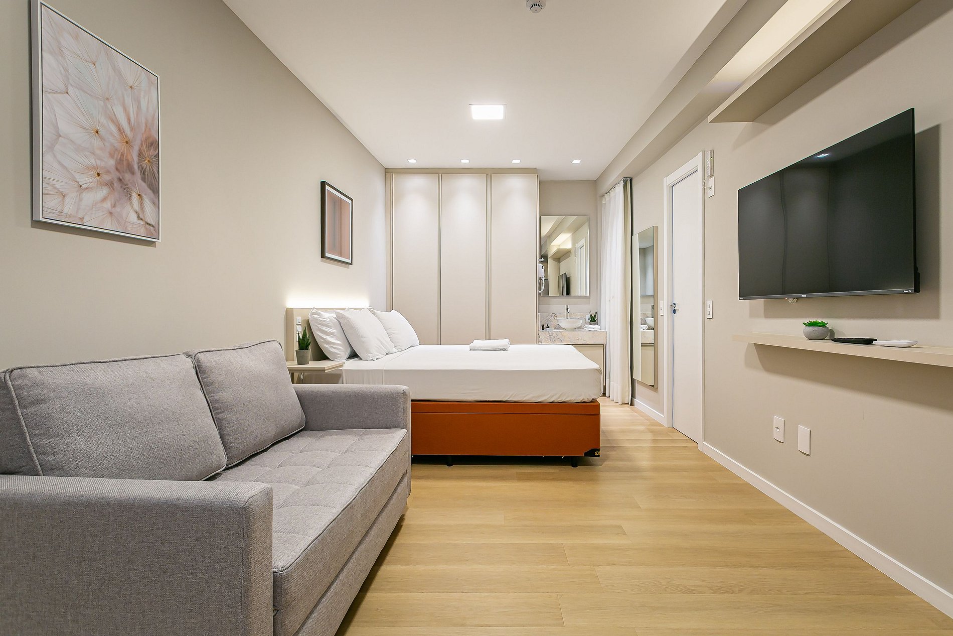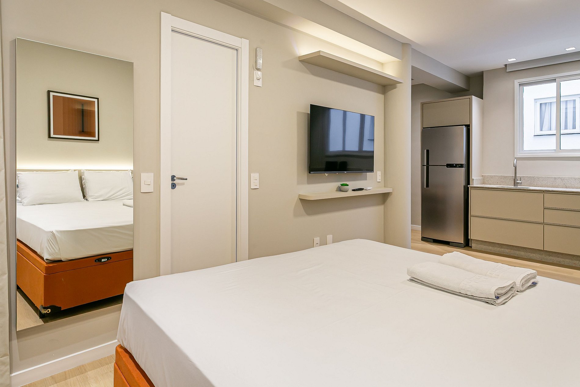 O Studio possui área de diversos tamanhos. Sendo equipado com cama CASAL, televisão SMARTV e ar-condicionado.