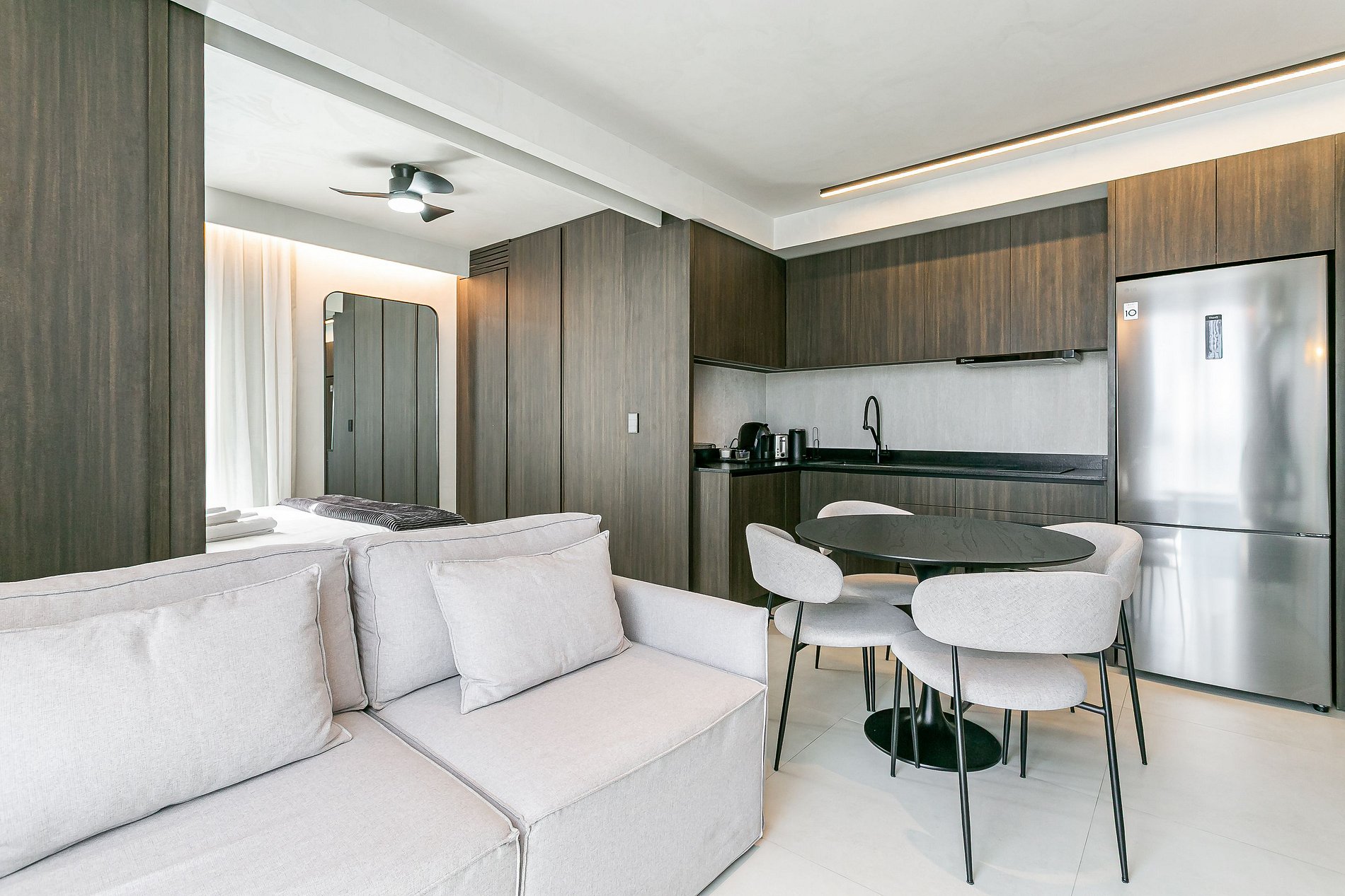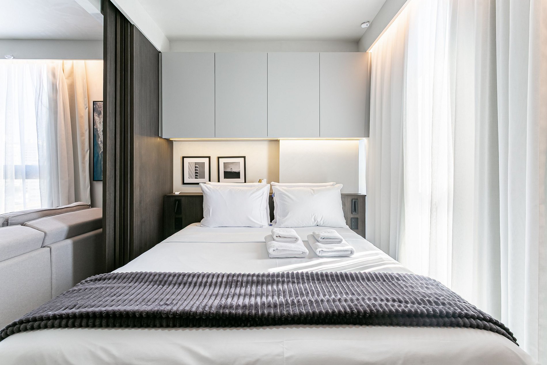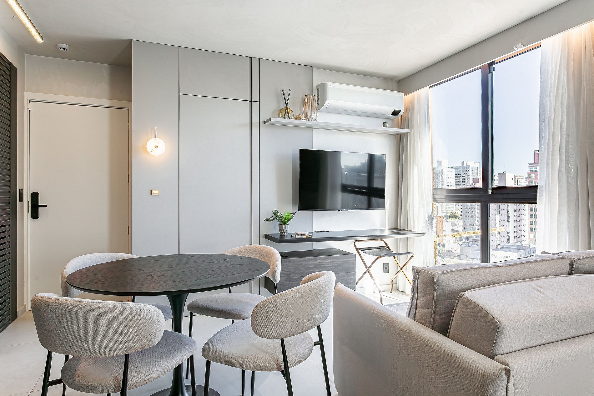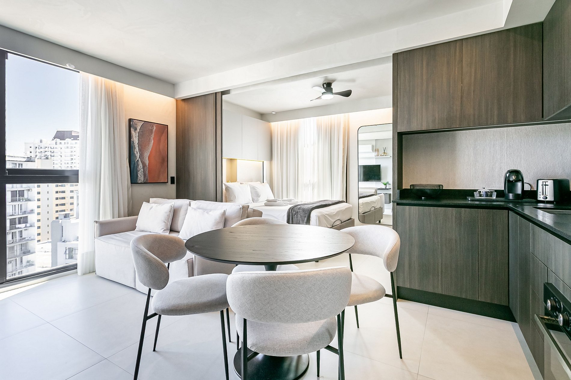 The 37.5 m² studio features a QUEEN-SIZE BED, 50” SMART TV, and SPLIT AIR CONDITIONING (HOT & COLD).