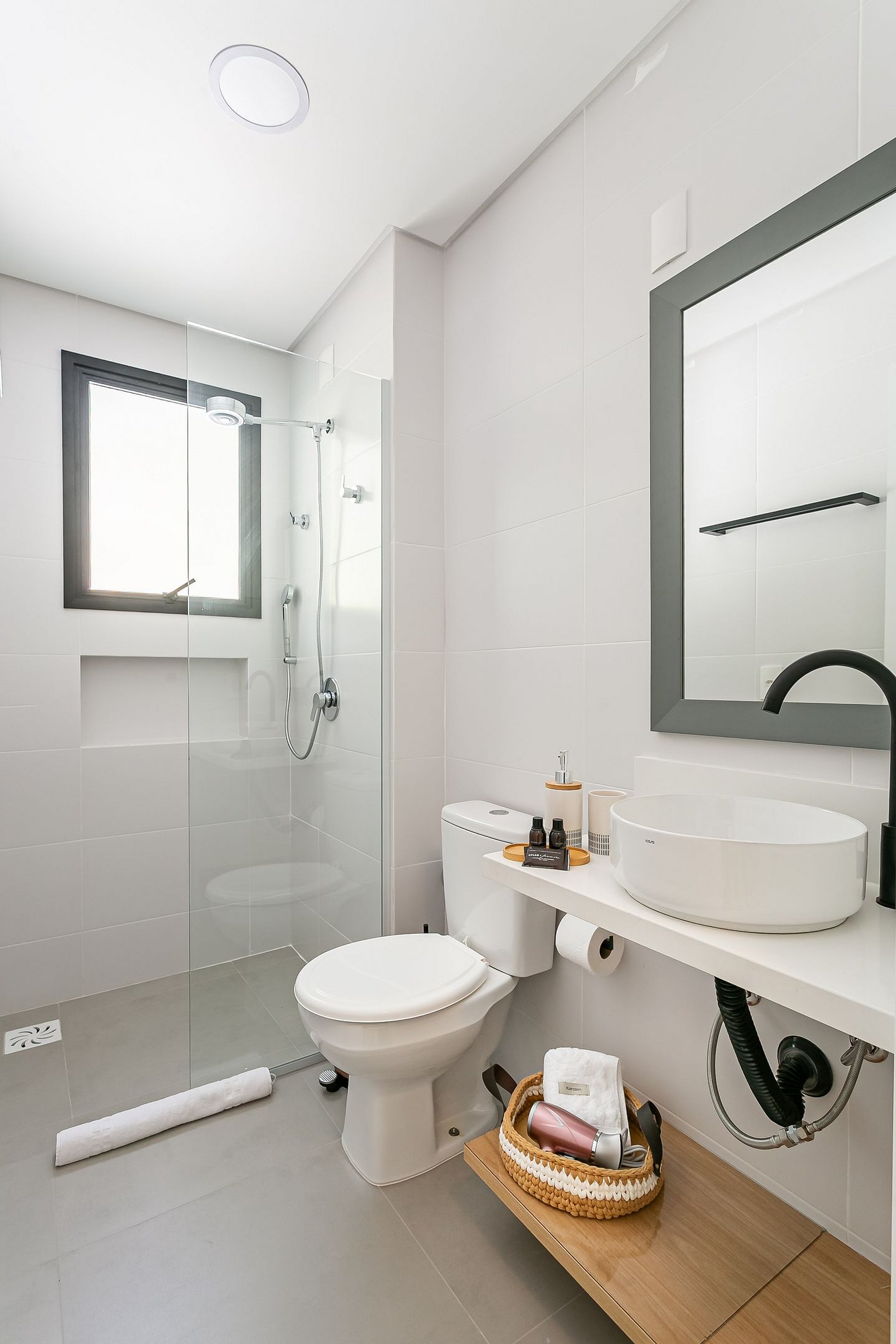 - 1 bathroom with shower and hair dryer