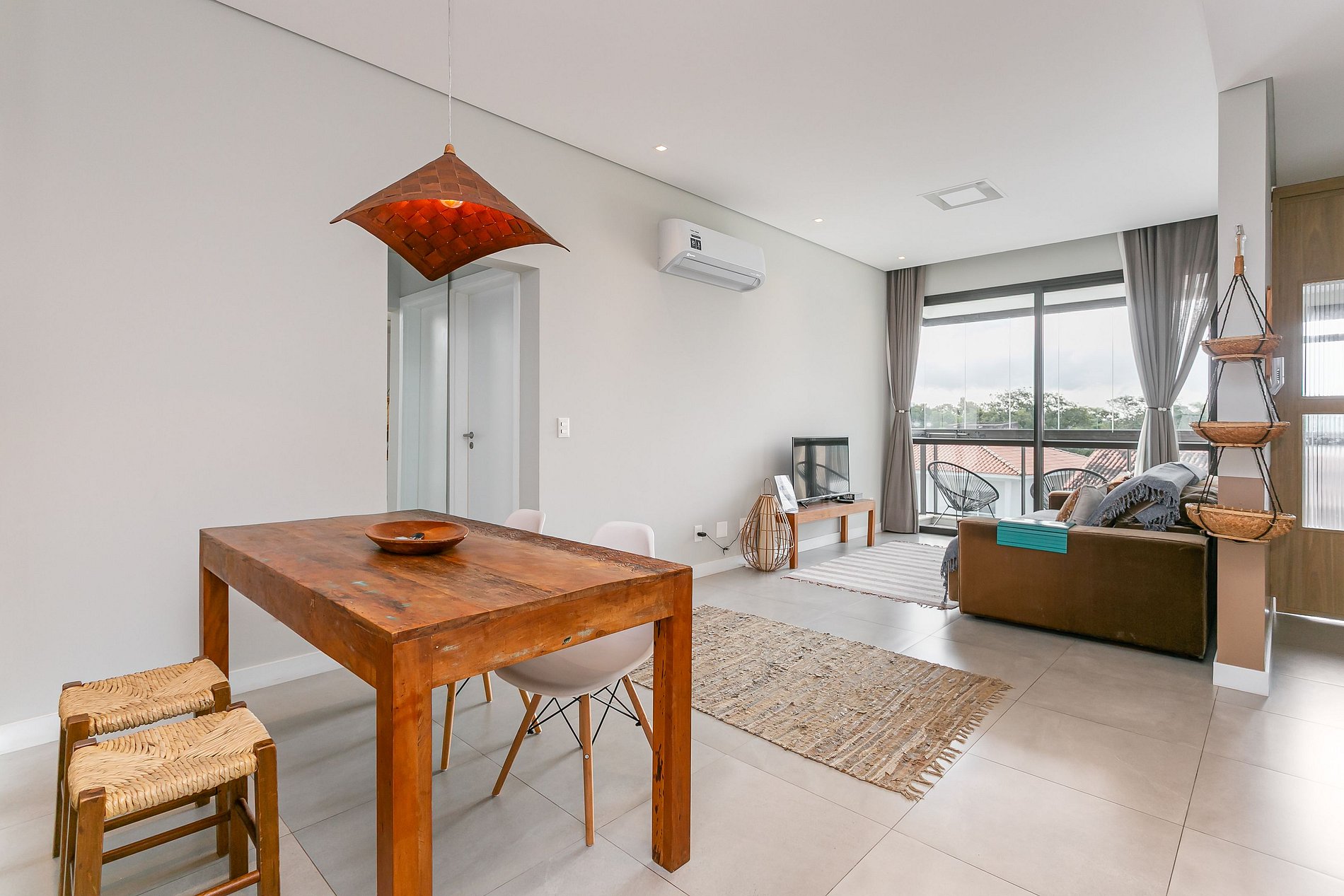 The 86m² property has a suite with a QUEEN bed, a suite with a DOUBLE bed and SPLIT AC, a living room with a 43” TV and a balcony with a barbecue. Both rooms have AC SPLIT (HOT AND COLD)