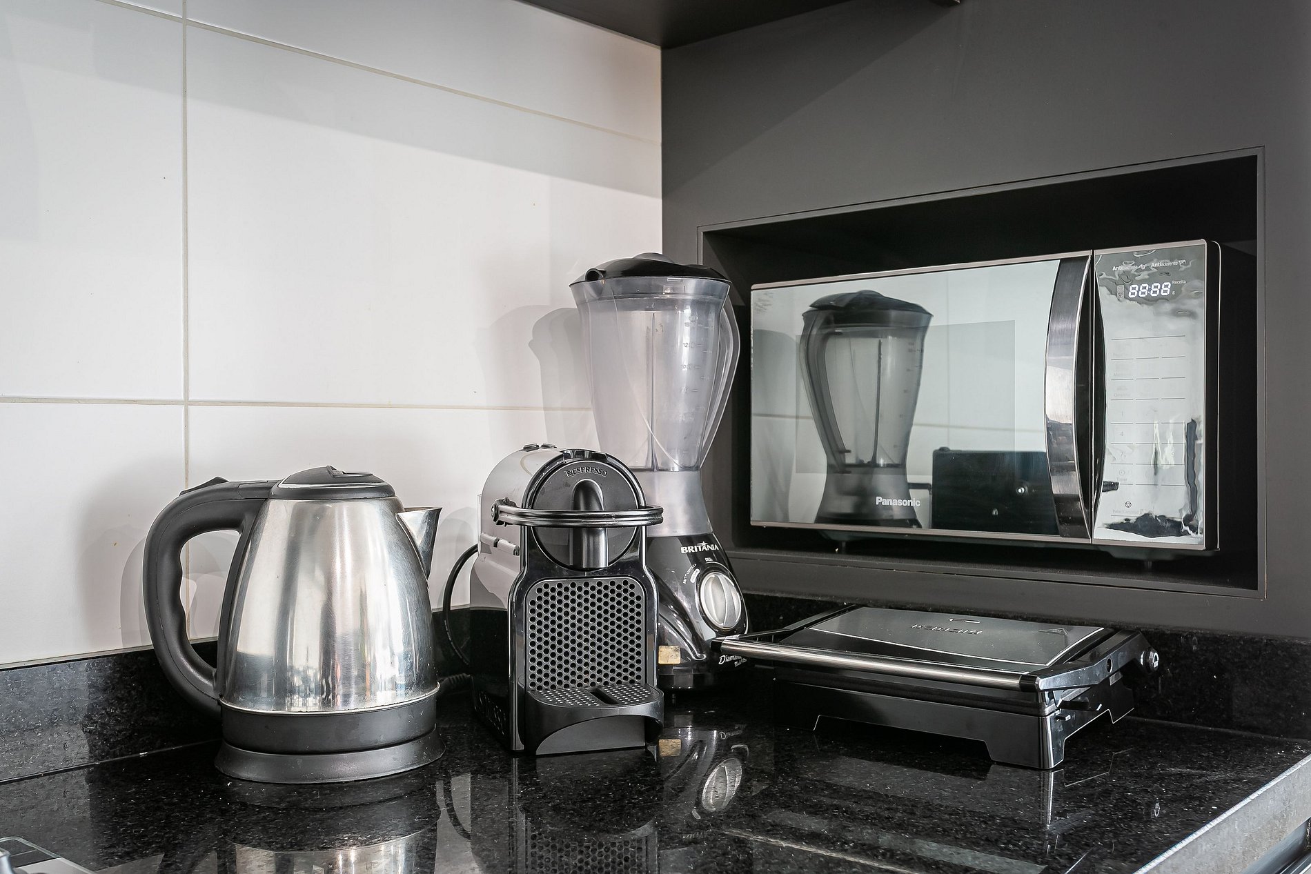- Fully equipped kitchen with coffee maker, refrigerator with freezer, blender, microwave, sandwich maker, kitchen utensils, and cookware set