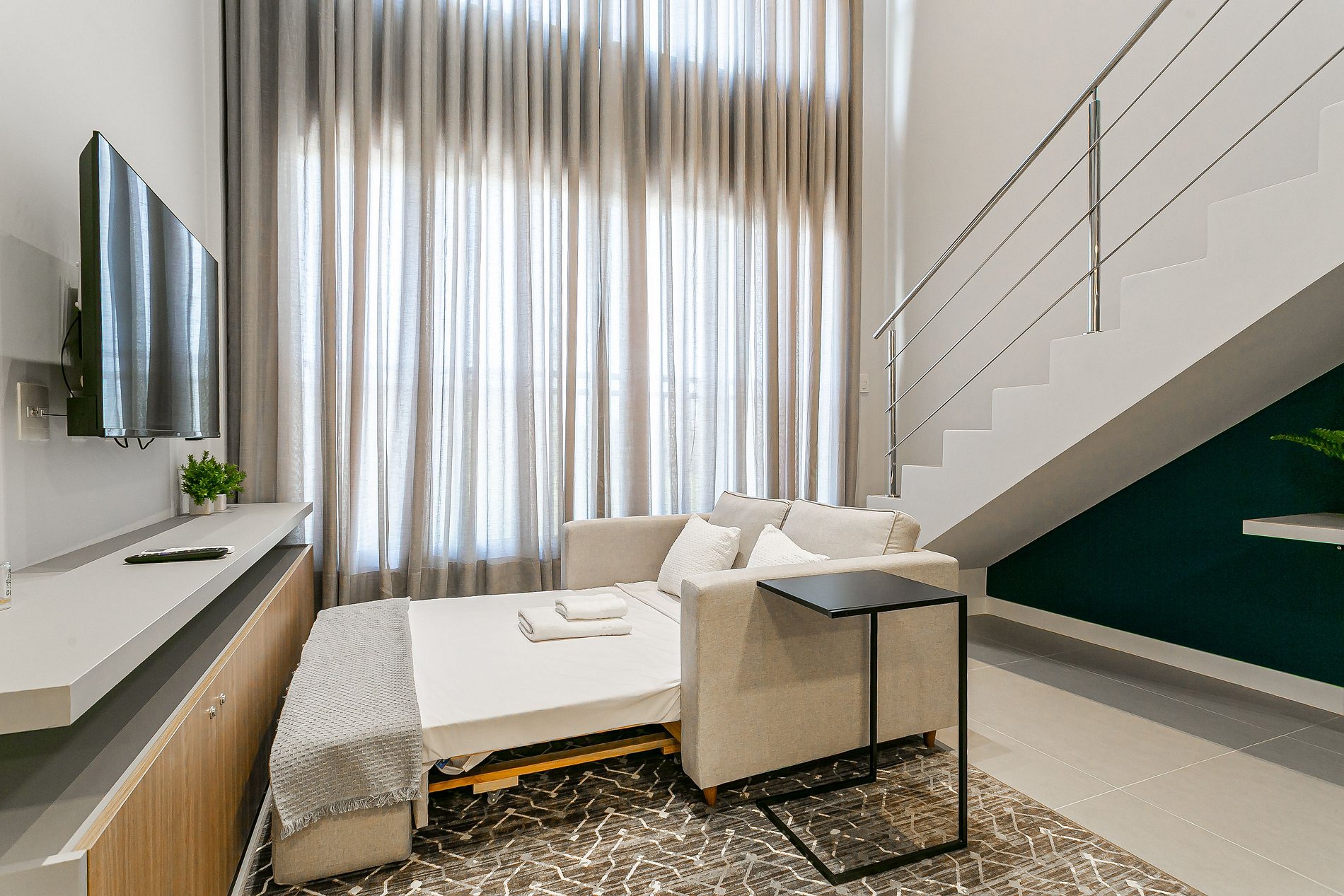 The 51.90 m² property features a queen bed, a single sofa bed, and a 50-inch smart TV. The studio also offers split AC (heating and cooling).