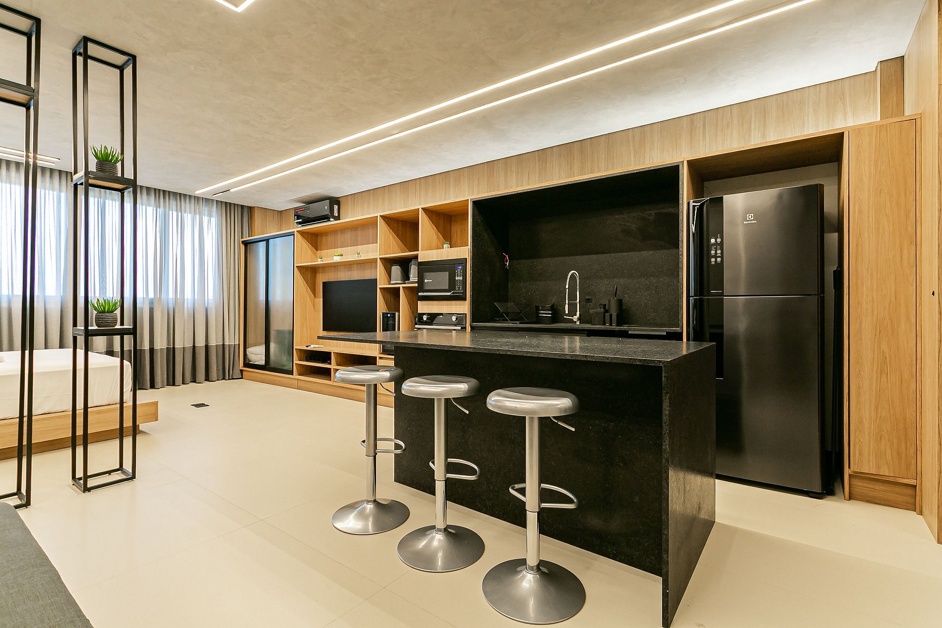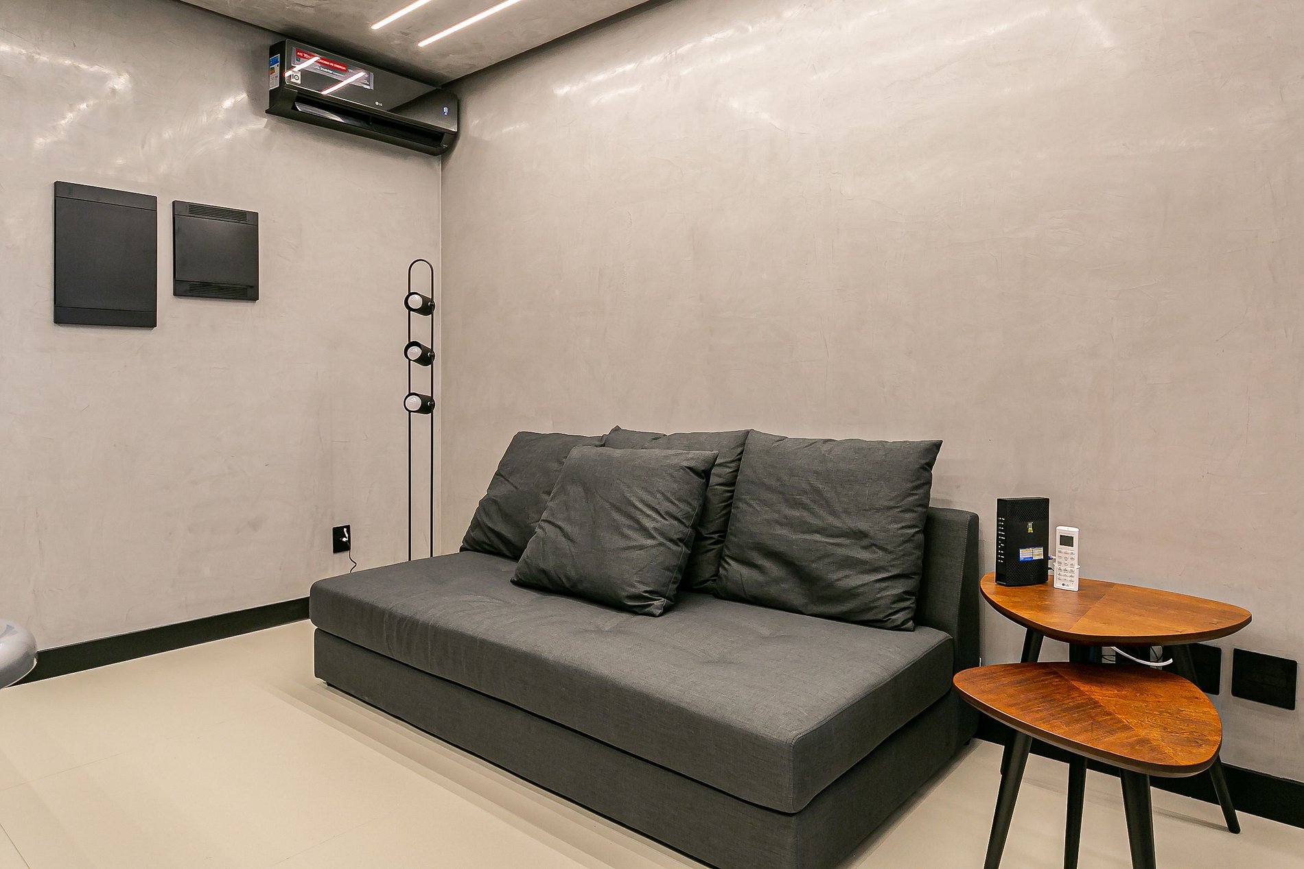 The 46m² studio has a Smart TV, SPLIT AC, a QUEEN bed and a SINGLE sofa bed.