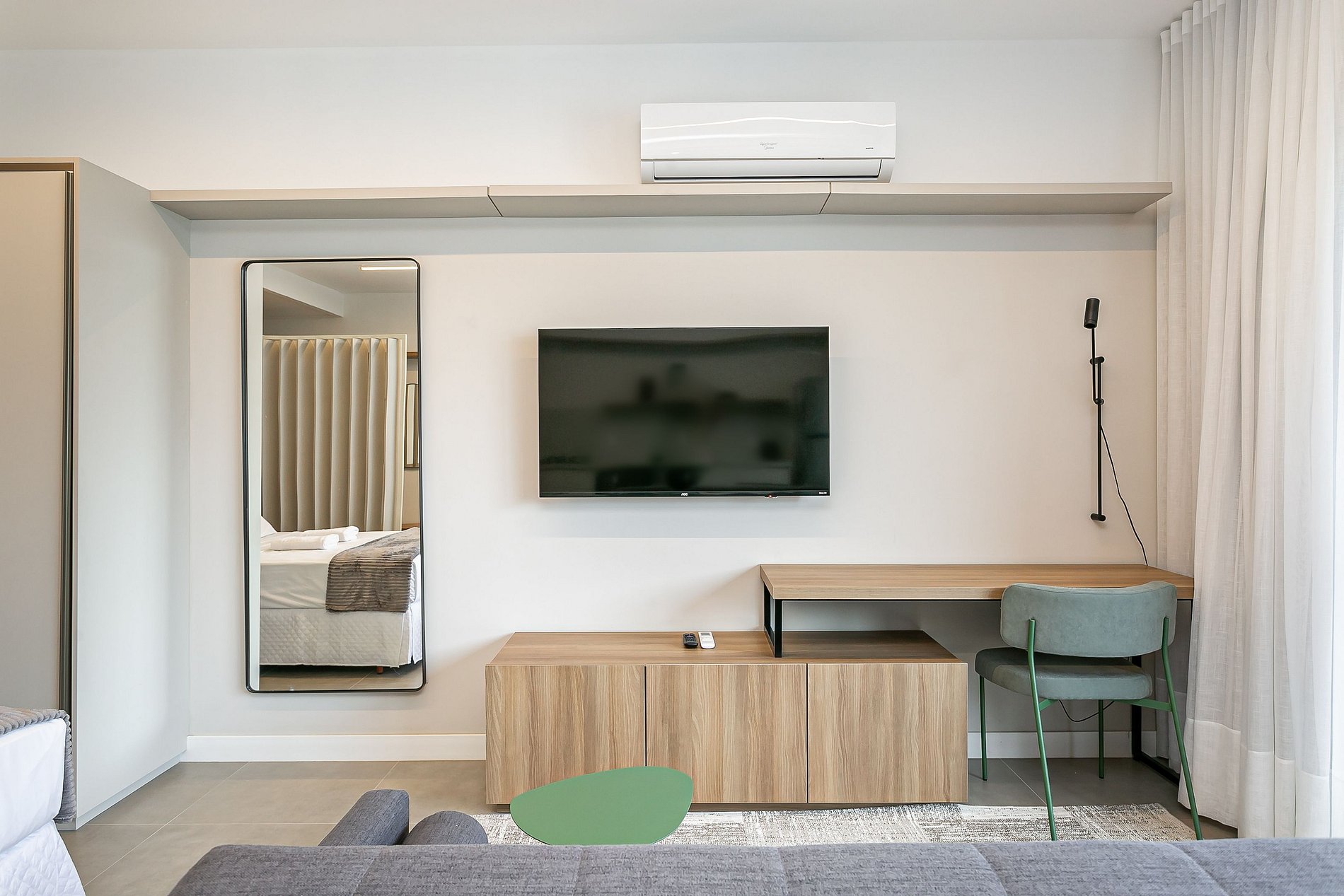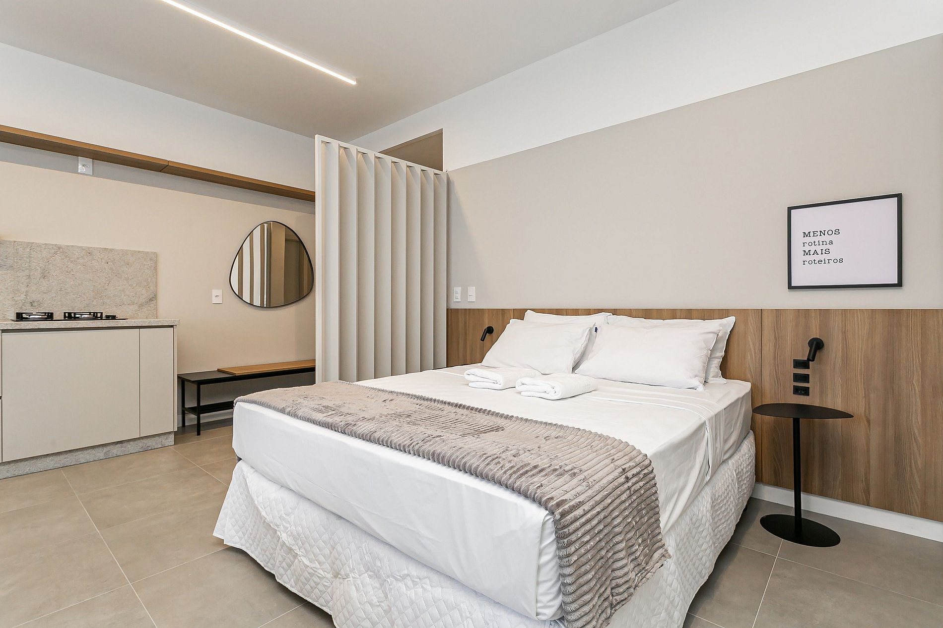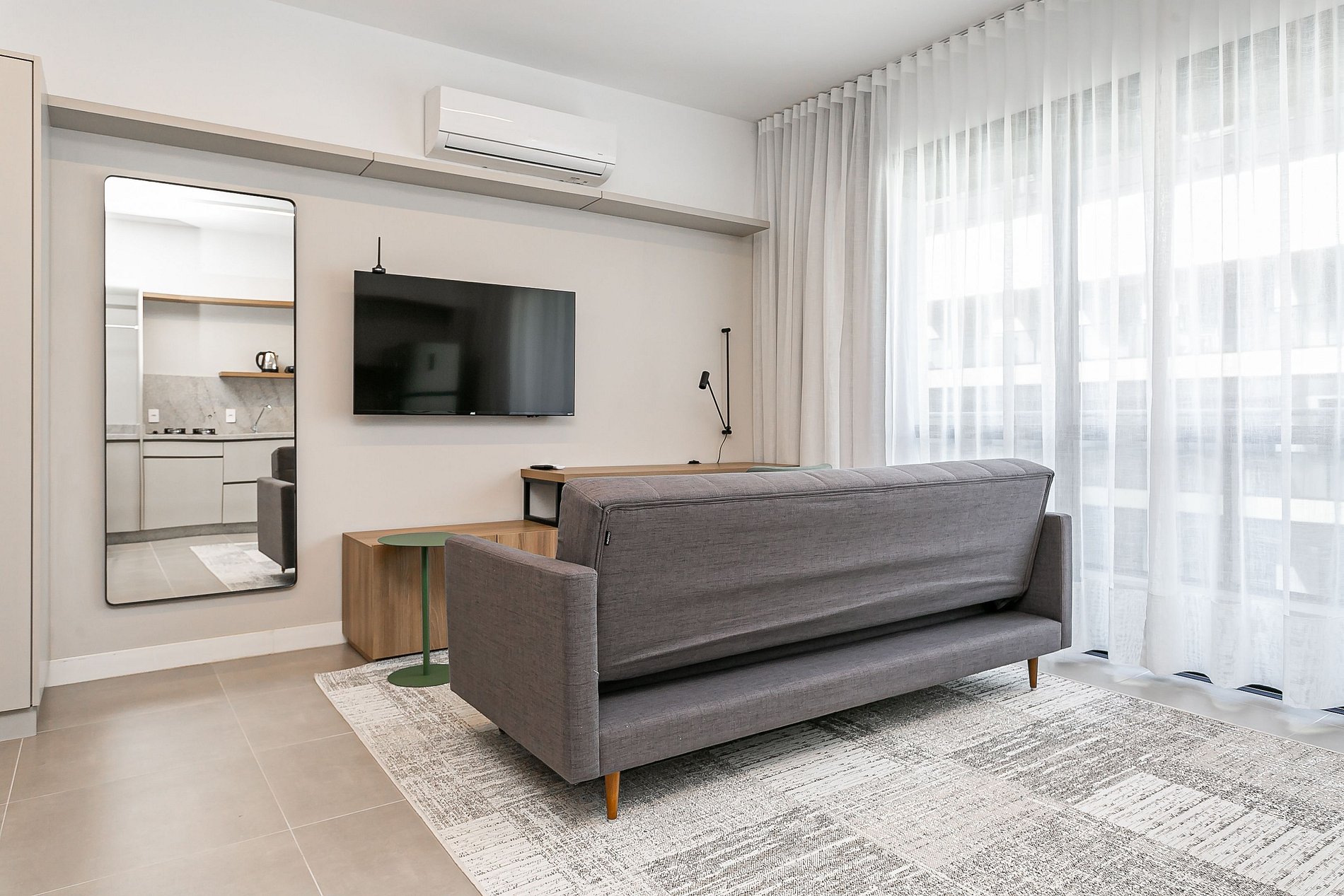 The 44m² studio has a QUEEN bed, a SINGLE sofa bed, a 43” Smart TV and AC SPLIT.