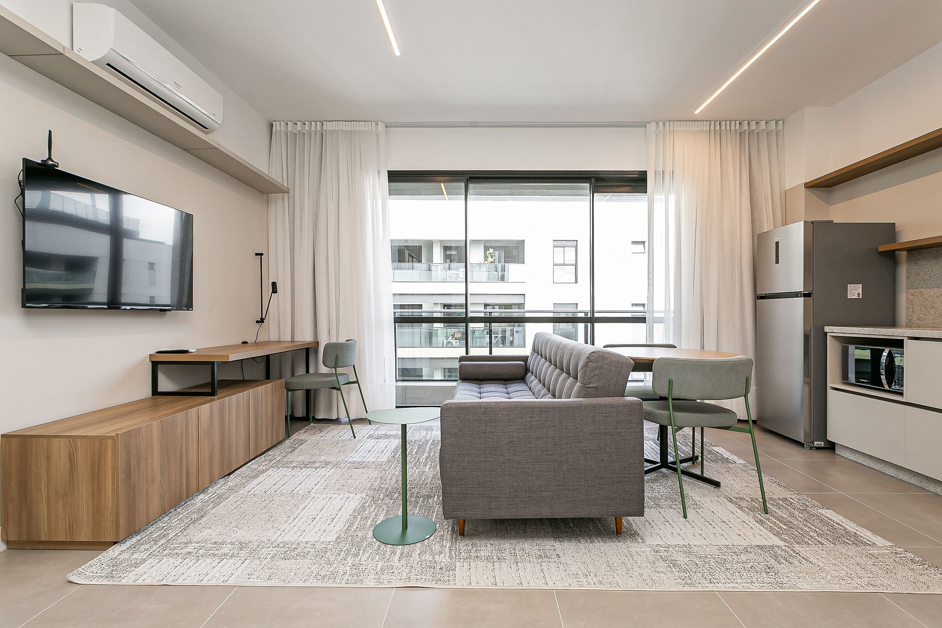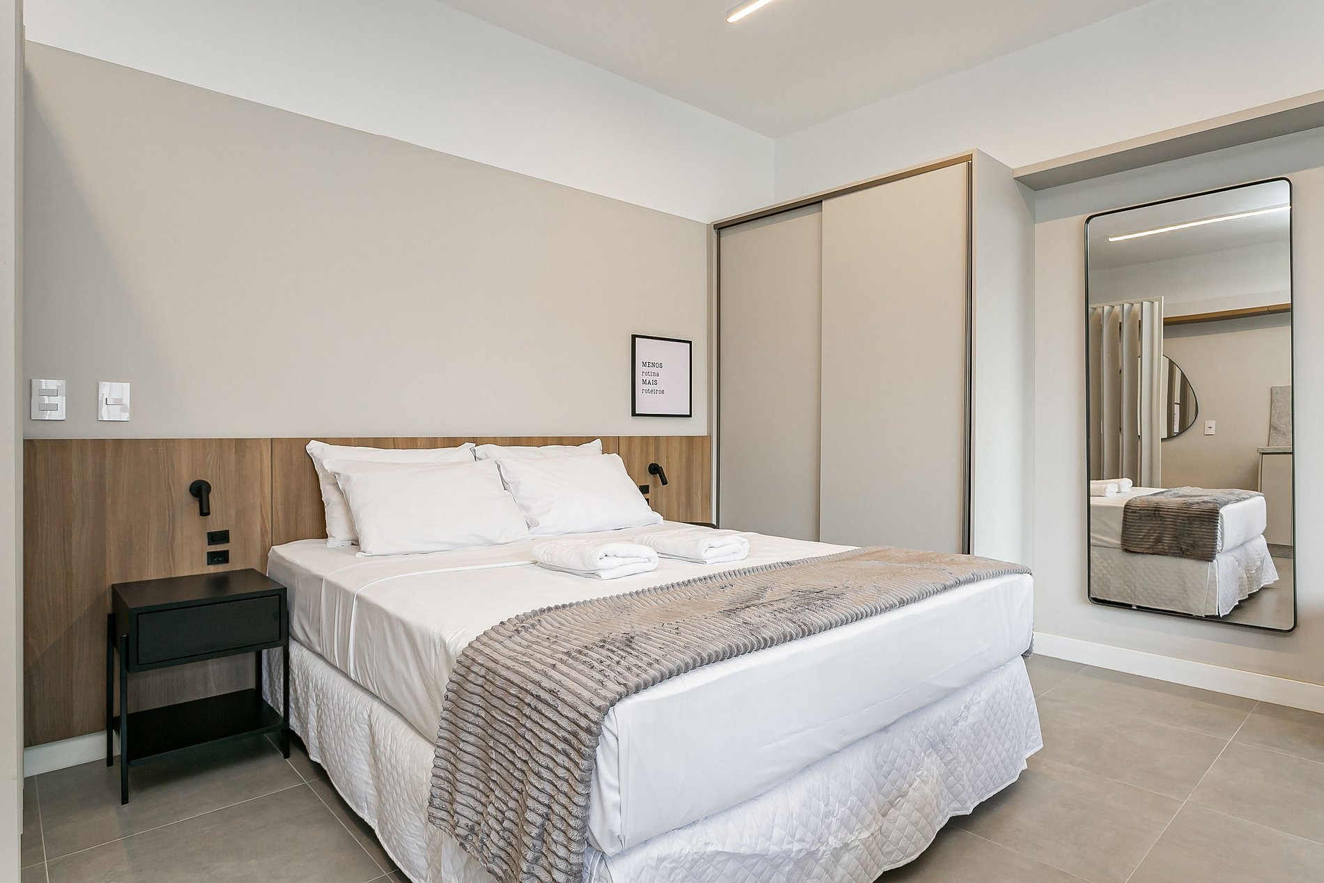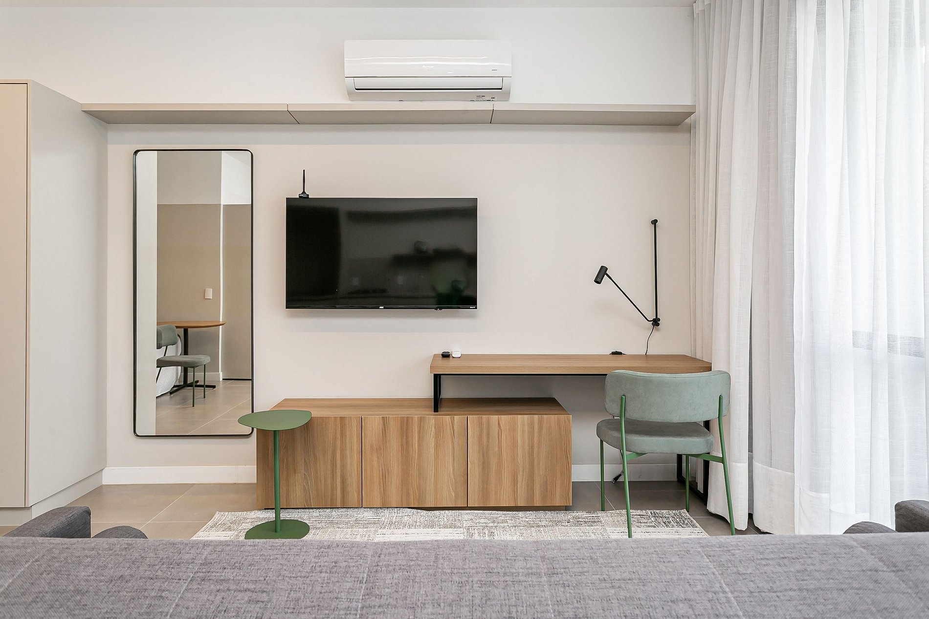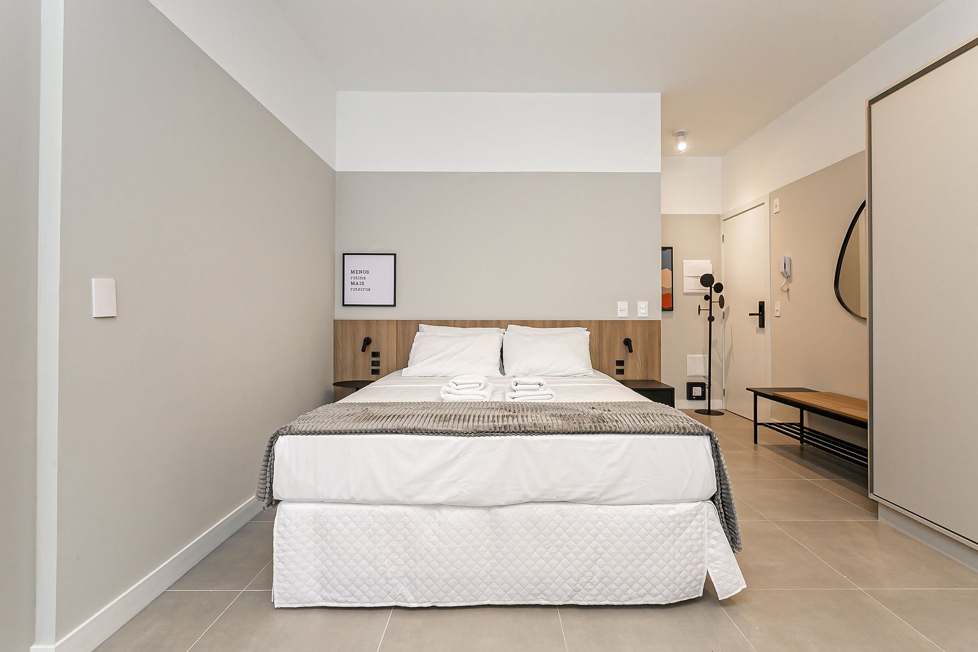 The 44m² studio has a QUEEN bed, a SINGLE sofa bed, a 43” Smart TV and AC SPLIT.