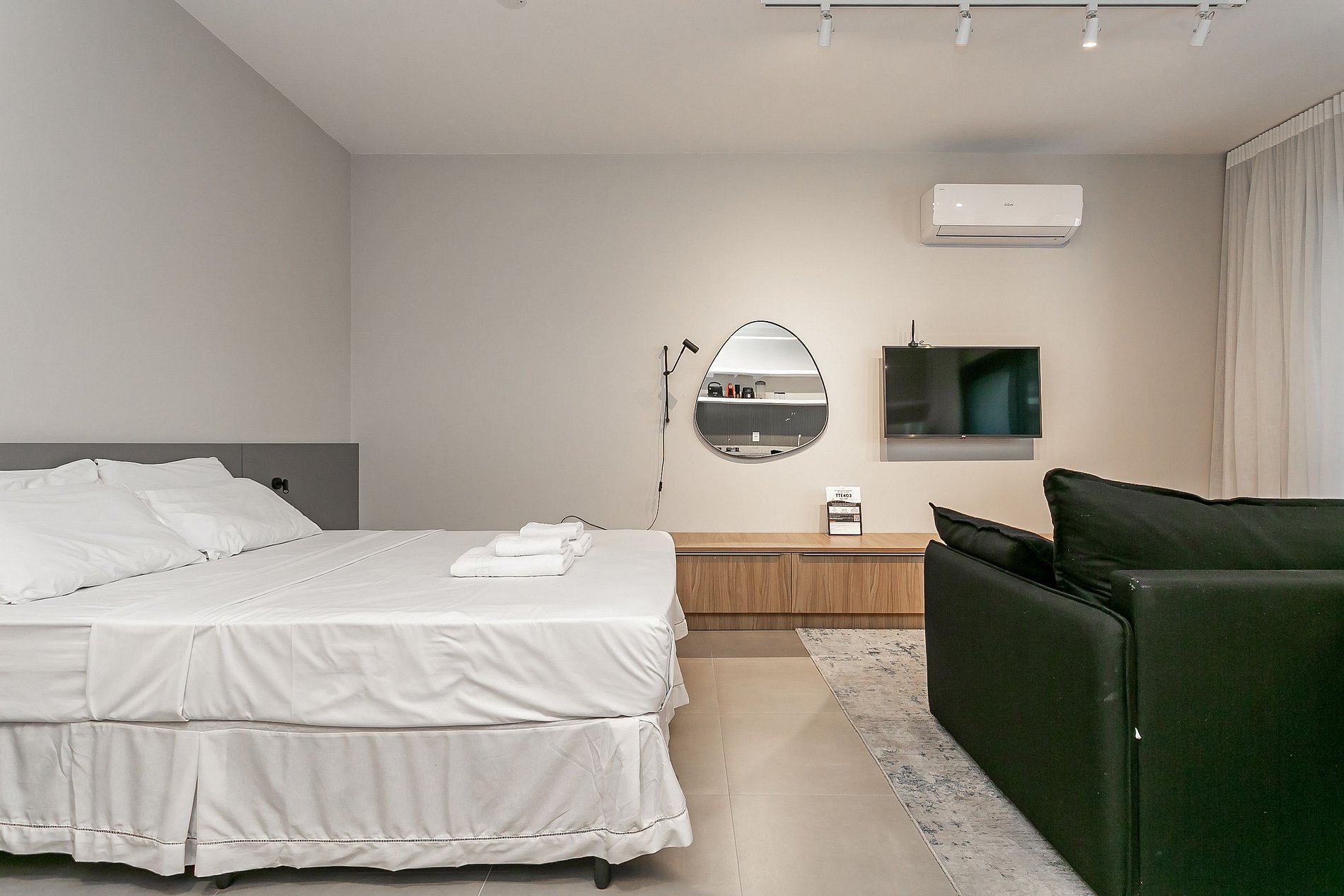 3º - Temos diversas unidades de studios neste prédio, sendo todos projetados para você ter uma ótima estadia — o padrão dos móveis e facilidades são os mesmos, entretanto a vista, layout e design PODEM VARIAR.