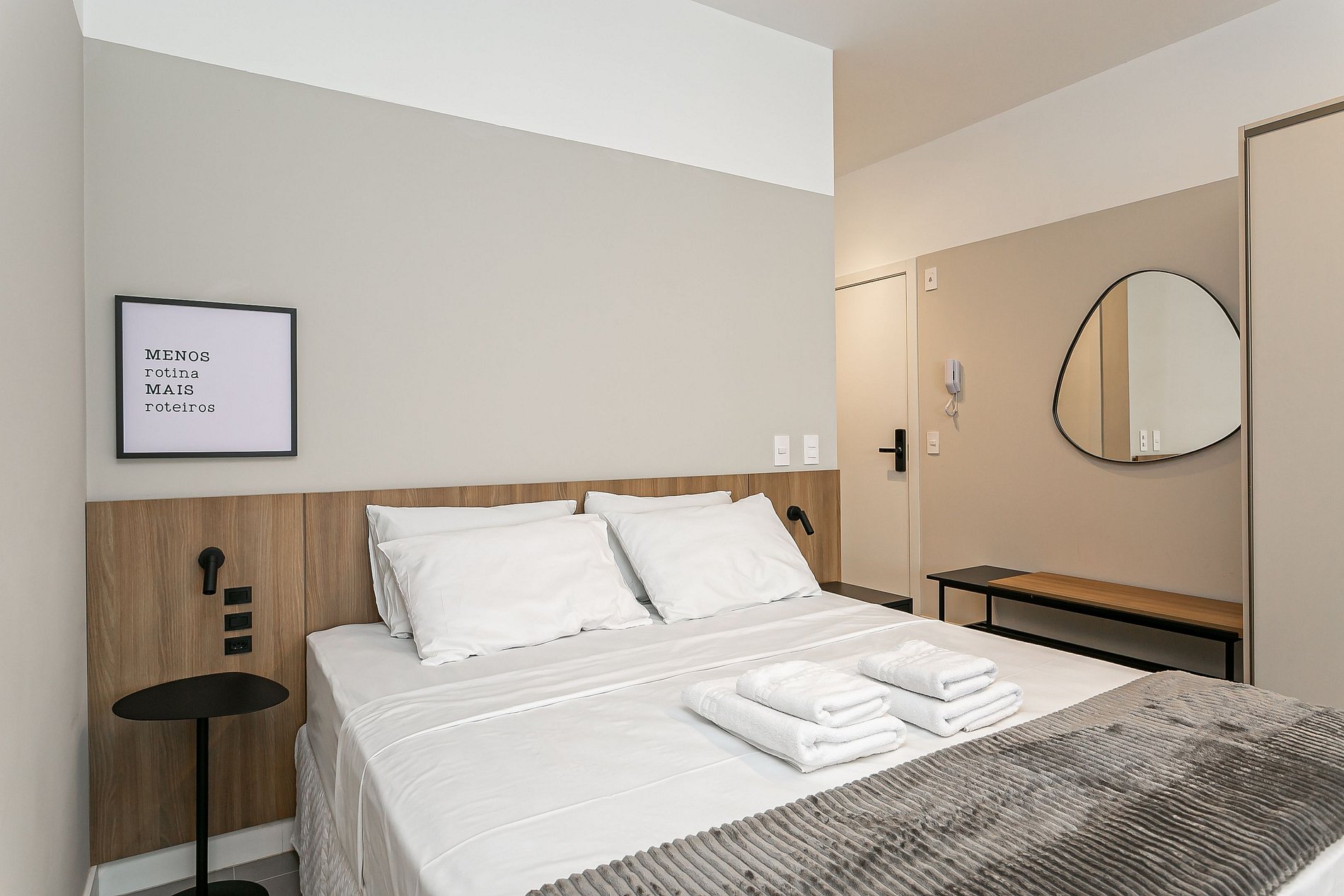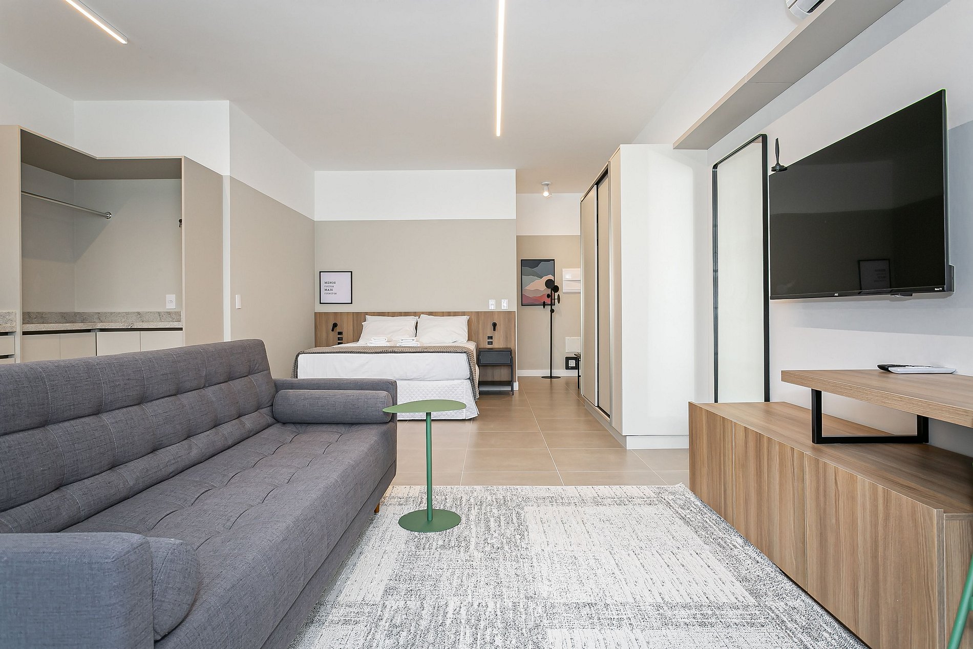 The 44m² studio has a QUEEN bed, a SINGLE sofa bed, a 43” Smart TV and AC SPLIT.