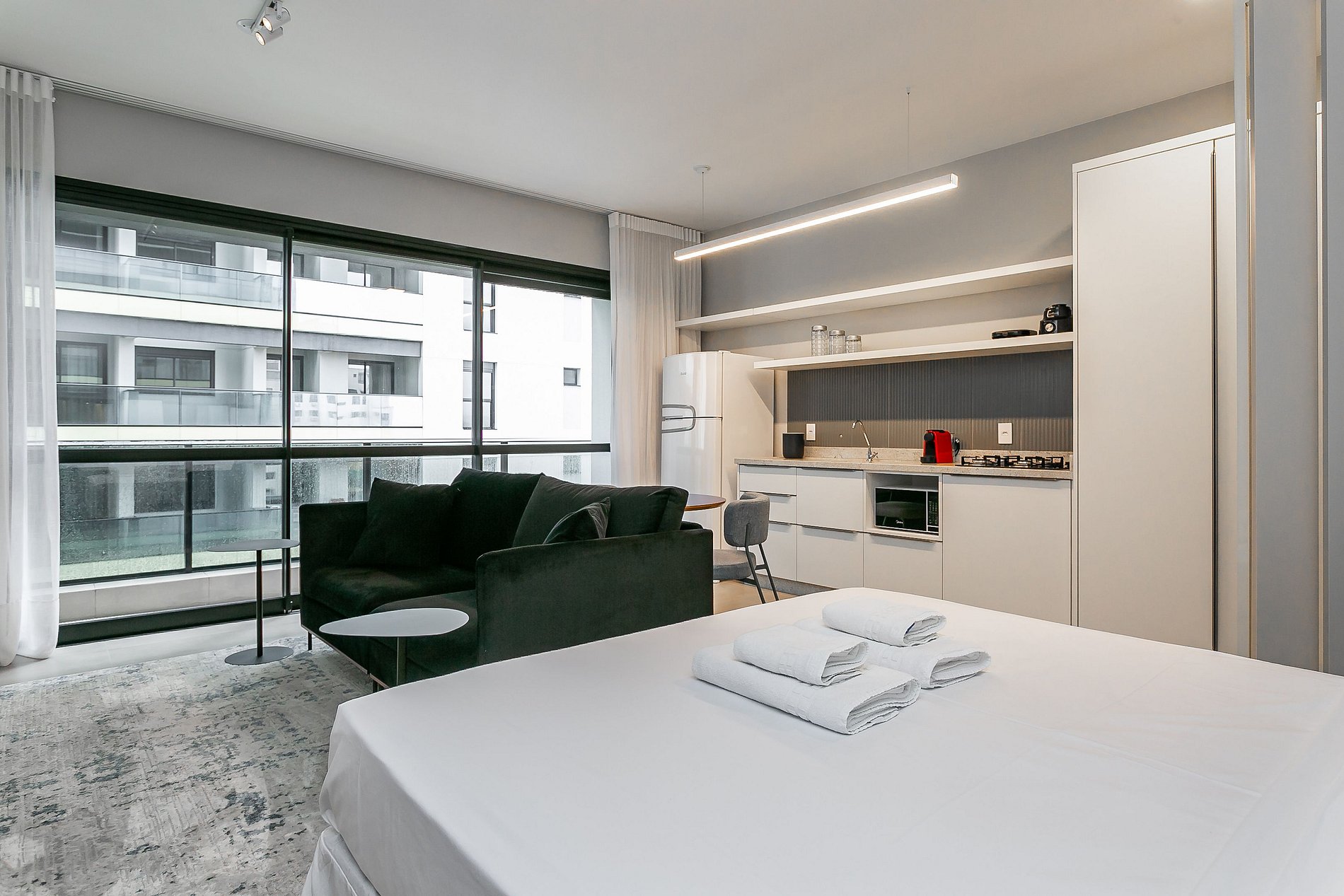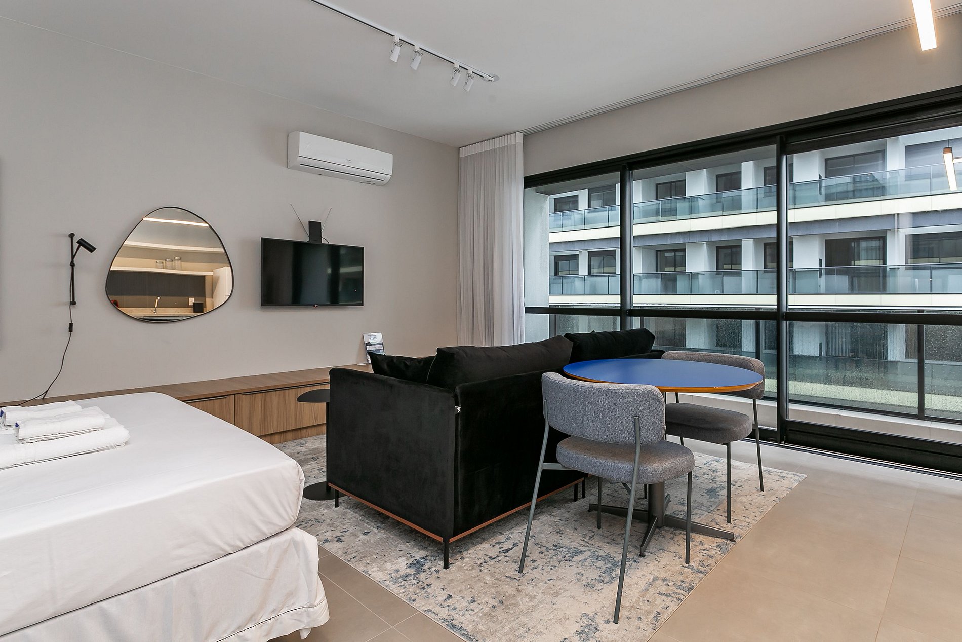 3º - Temos diversas unidades de studios neste prédio, sendo todos projetados para você ter uma ótima estadia — o padrão dos móveis e facilidades são os mesmos, entretanto a vista, layout e design PODEM VARIAR.