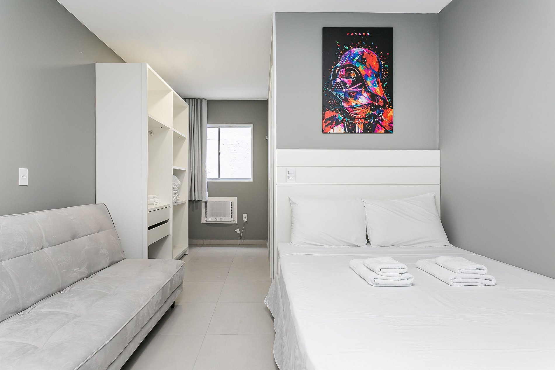 O Studio possui área de 25m2. Sendo equipado com cama CASAL, televisão SMARTV e ar-condicionado.