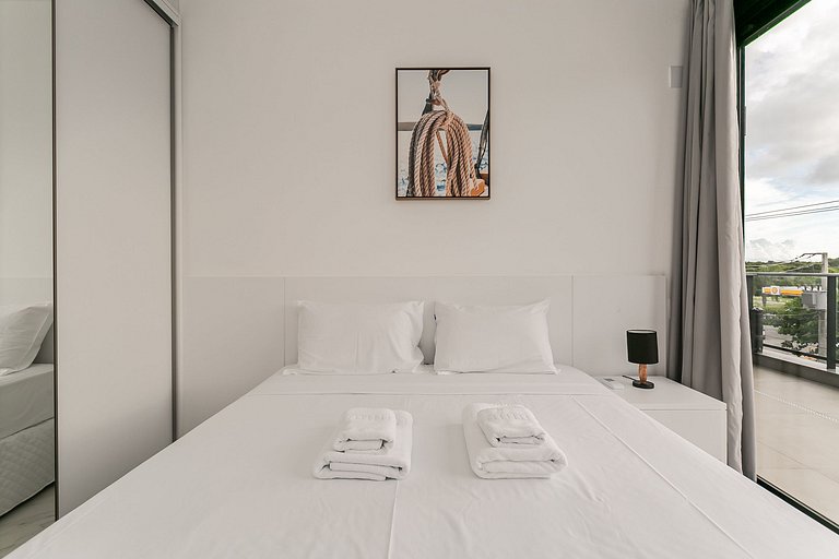 The 104m² property has a suite with a QUEEN BED, a bedroom with a QUEEN BED, a very cozy living room with Smart TV and a large balcony. All rooms are equipped with SPLIT AC.