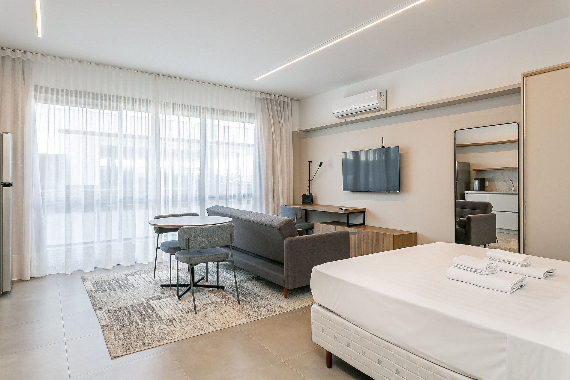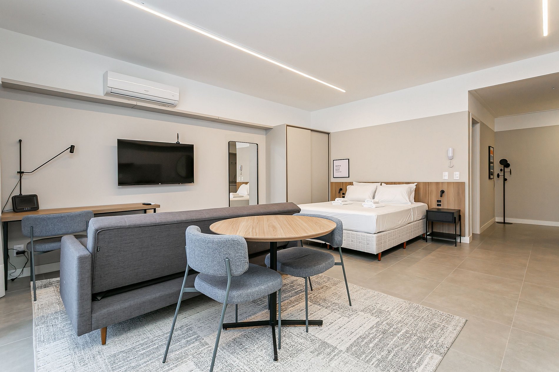 The 44m² studio has a QUEEN bed, a 43” Smart TV and AC SPLIT.
