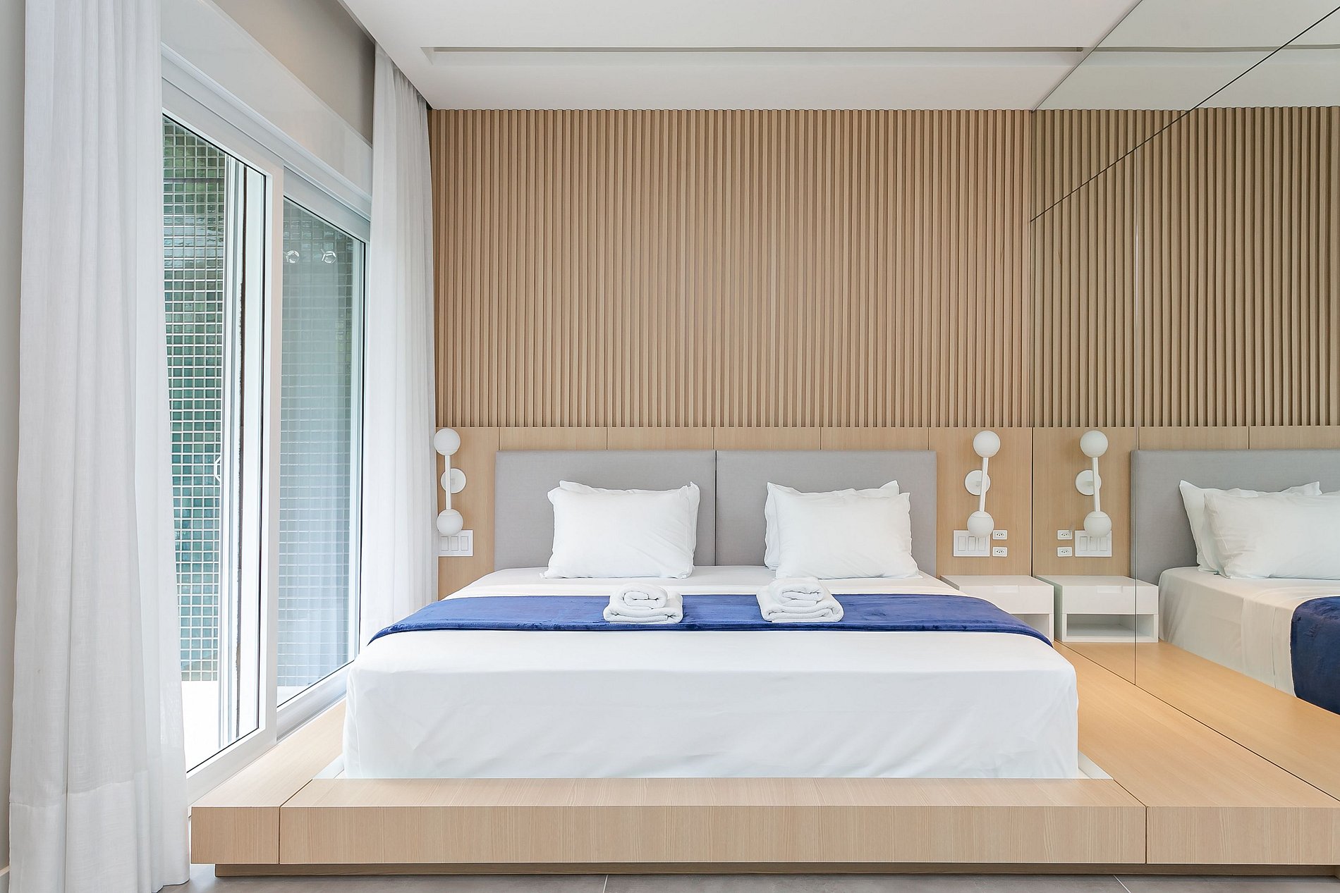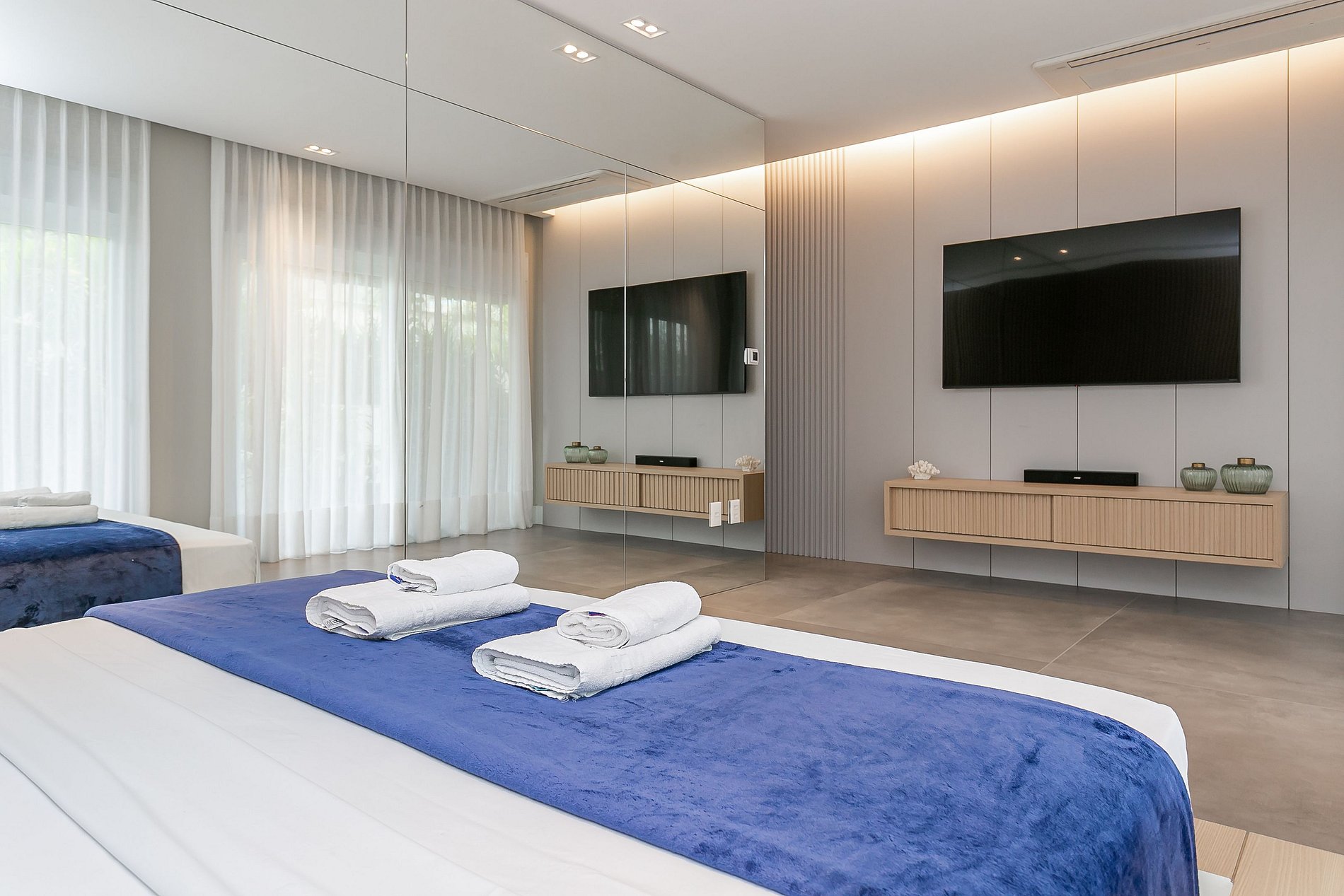 The 190m² apartment has two suites with Smart TV, a private outdoor area with barbecue and a living room with Smart TV, wine cellar and minibar. All rooms are equipped with SPLIT AC.
