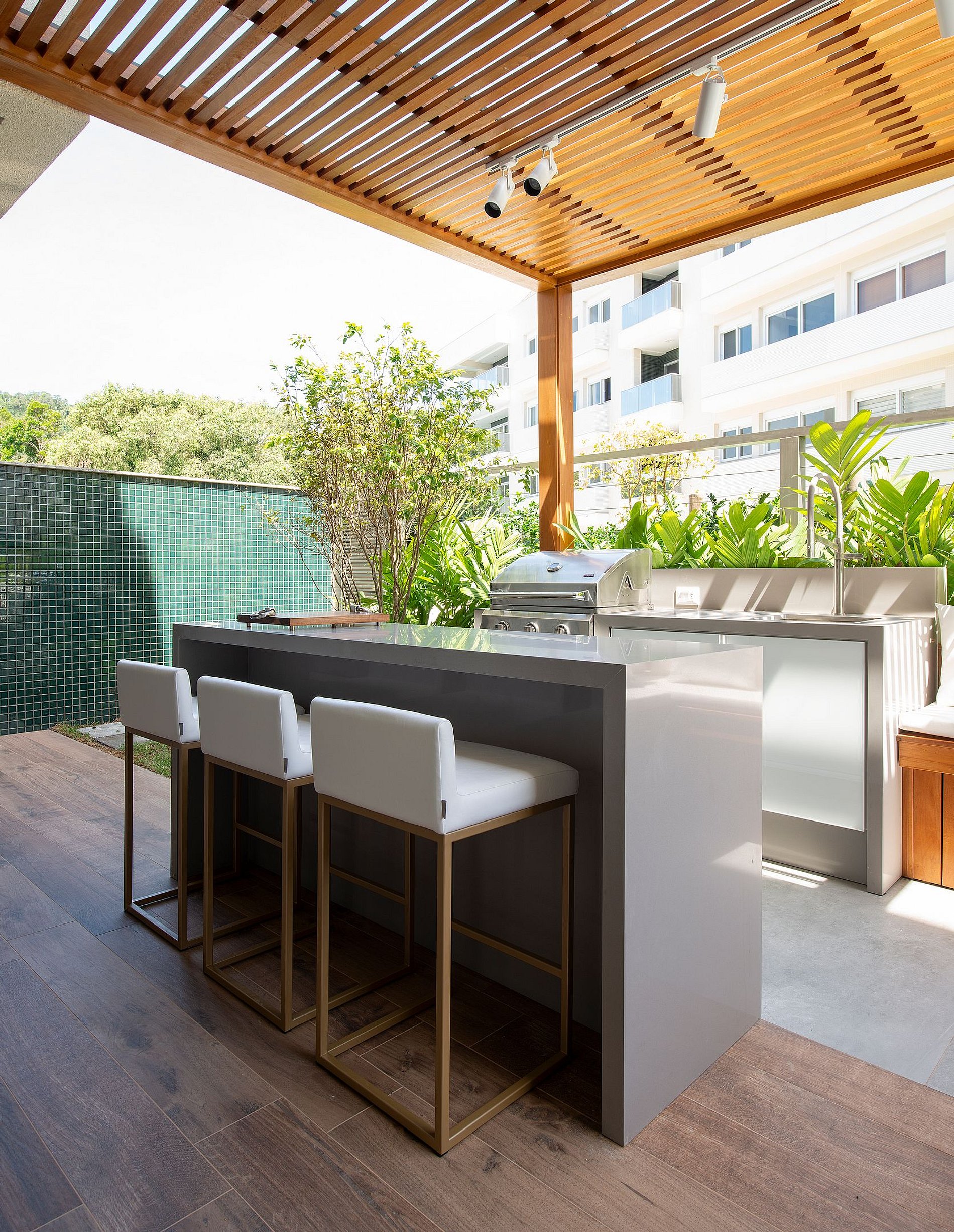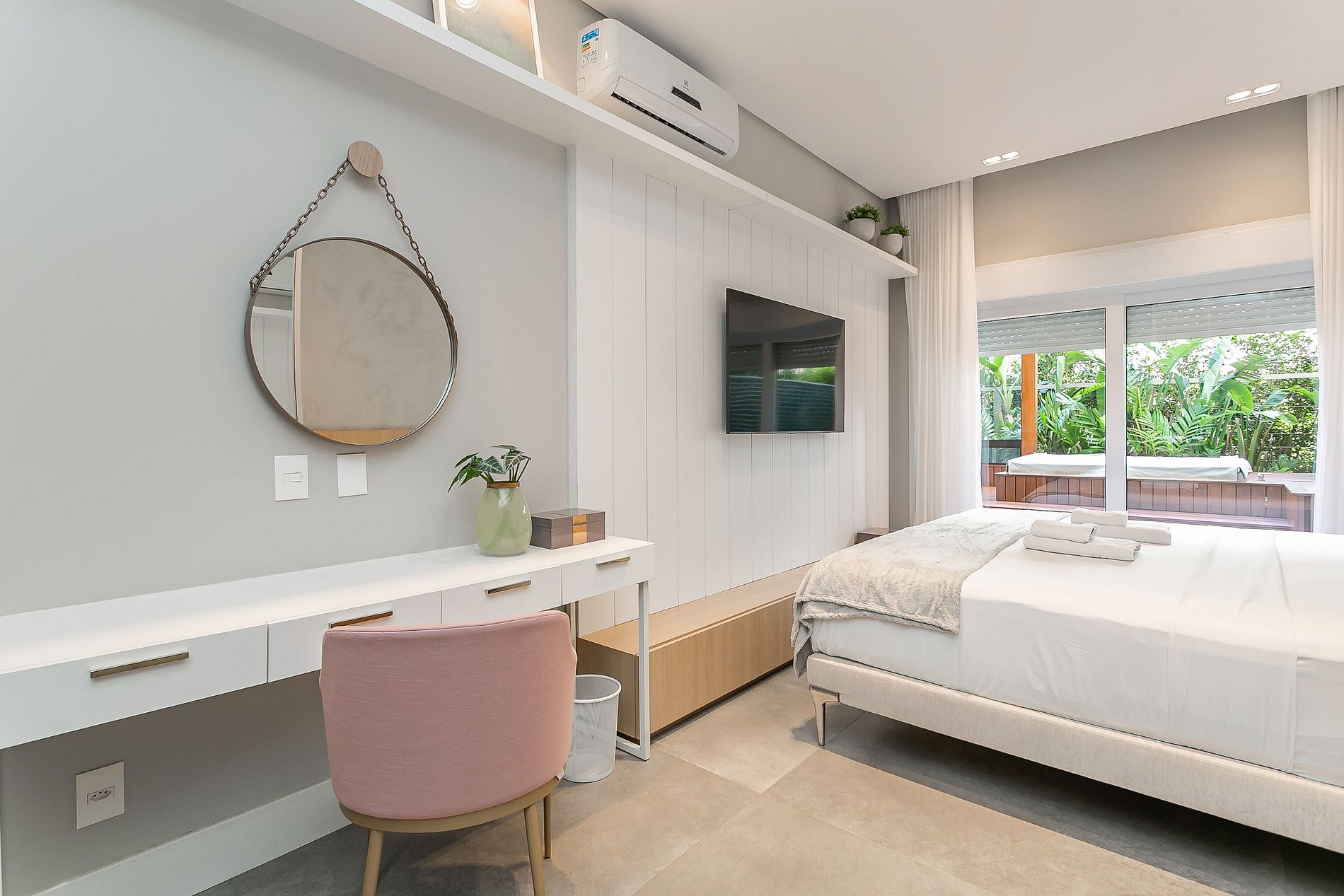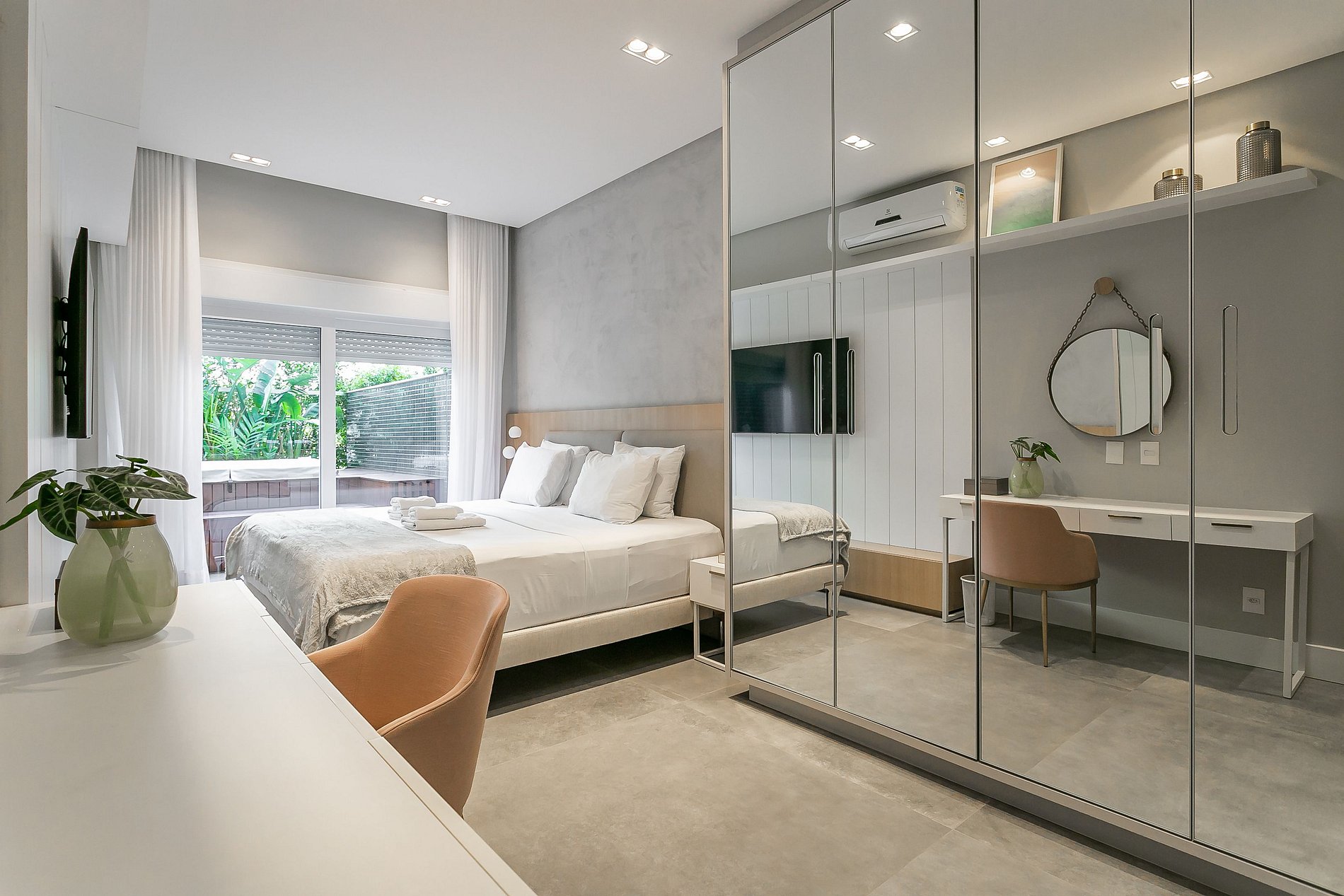 The 138m² apartment has two suites, a wide private outdoor area and a living room with Smart TV and wine cellar. All rooms are equipped with SPLIT AC.