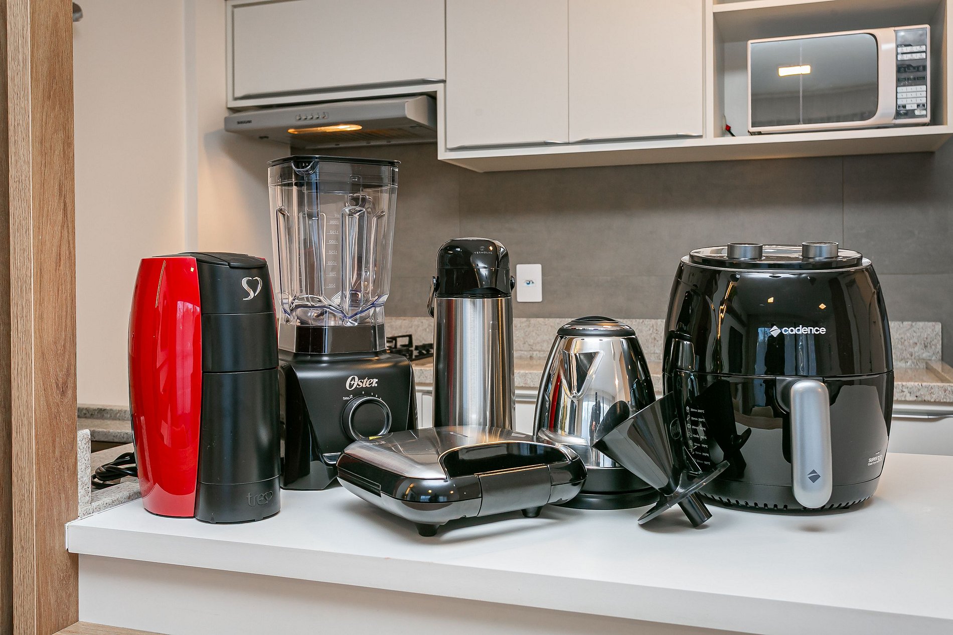 - Cozinha completa com cafeteira, geladeira, liquidificador, sanduicheira, utensílios de cozinha e jogo de panelas
