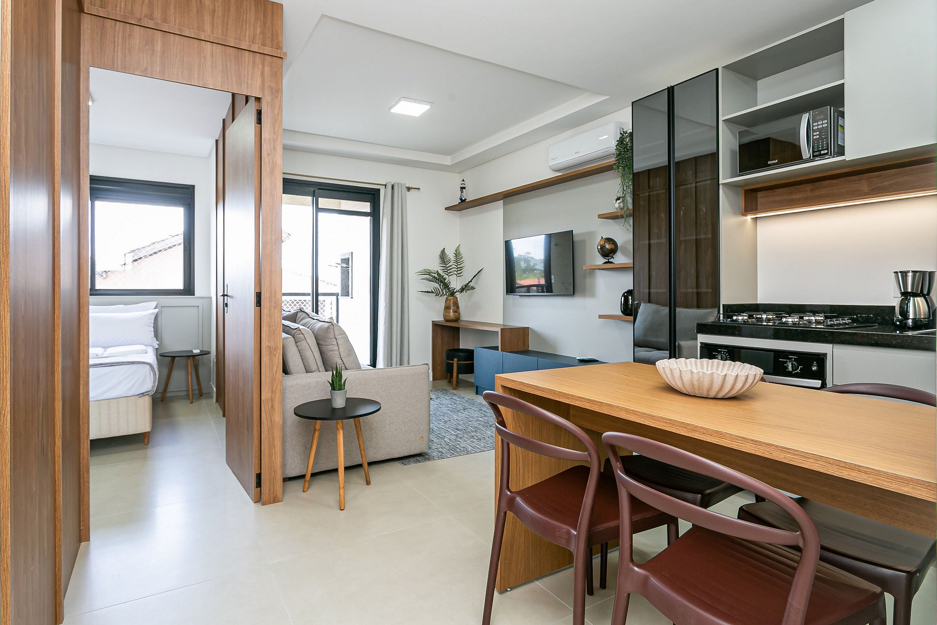 Com 53,62 m², oferece quarto com cama casal e colchão EMMA, sala com Smart TV 43”, sofá-cama casal, varanda com churrasqueira e AC SPLIT (QUENTE E FRIO) em todos os cômodos.