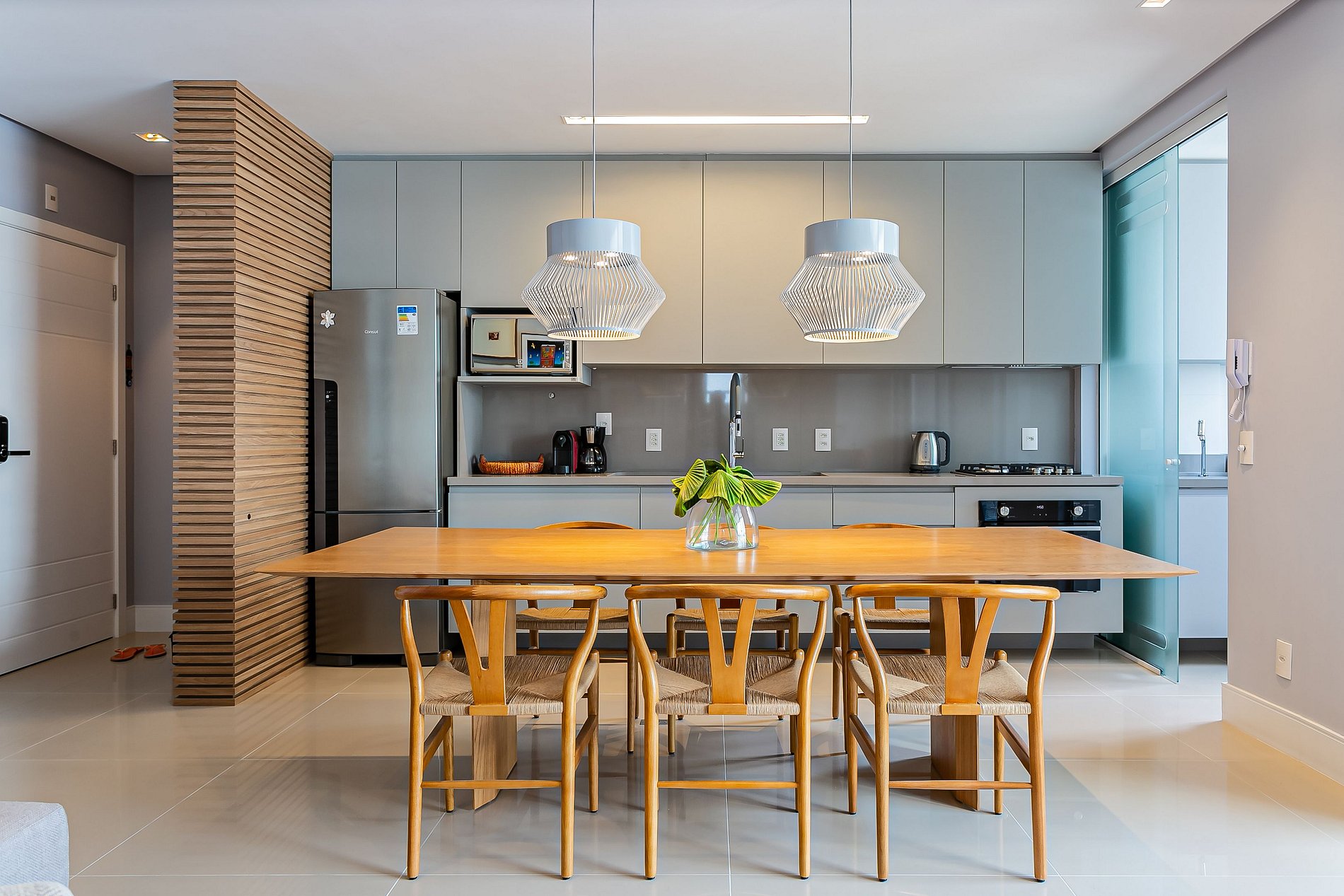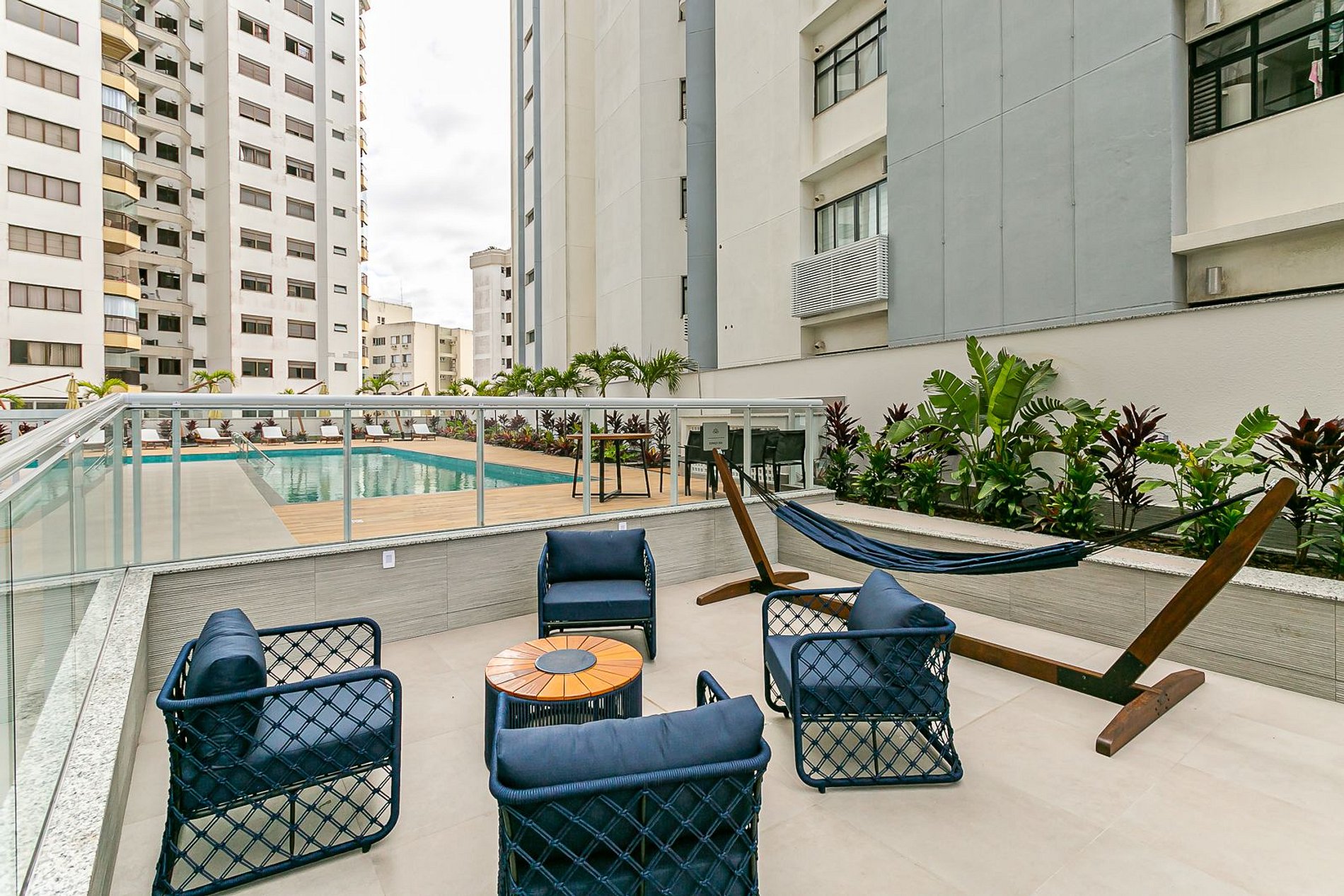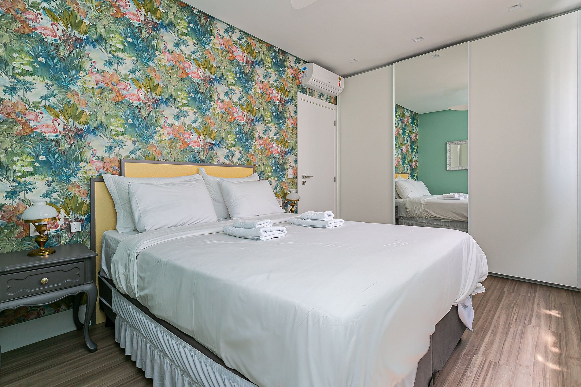 O imóvel de 99m² conta com duas suítes, uma sala de estar com Smart TV e uma sacada com churrasqueira. Todos os cômodos são equipados com Ar-condicionado SPLIT.