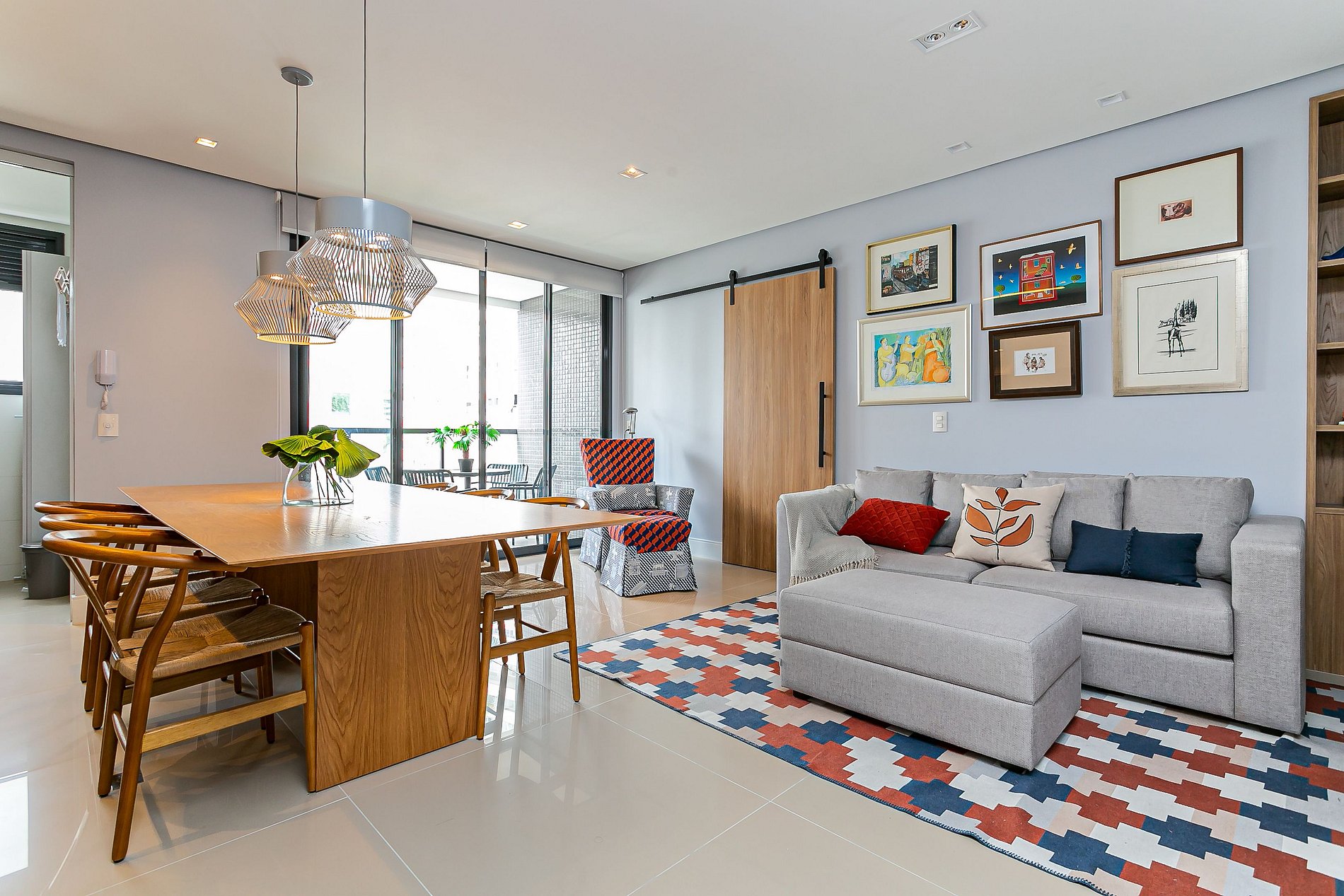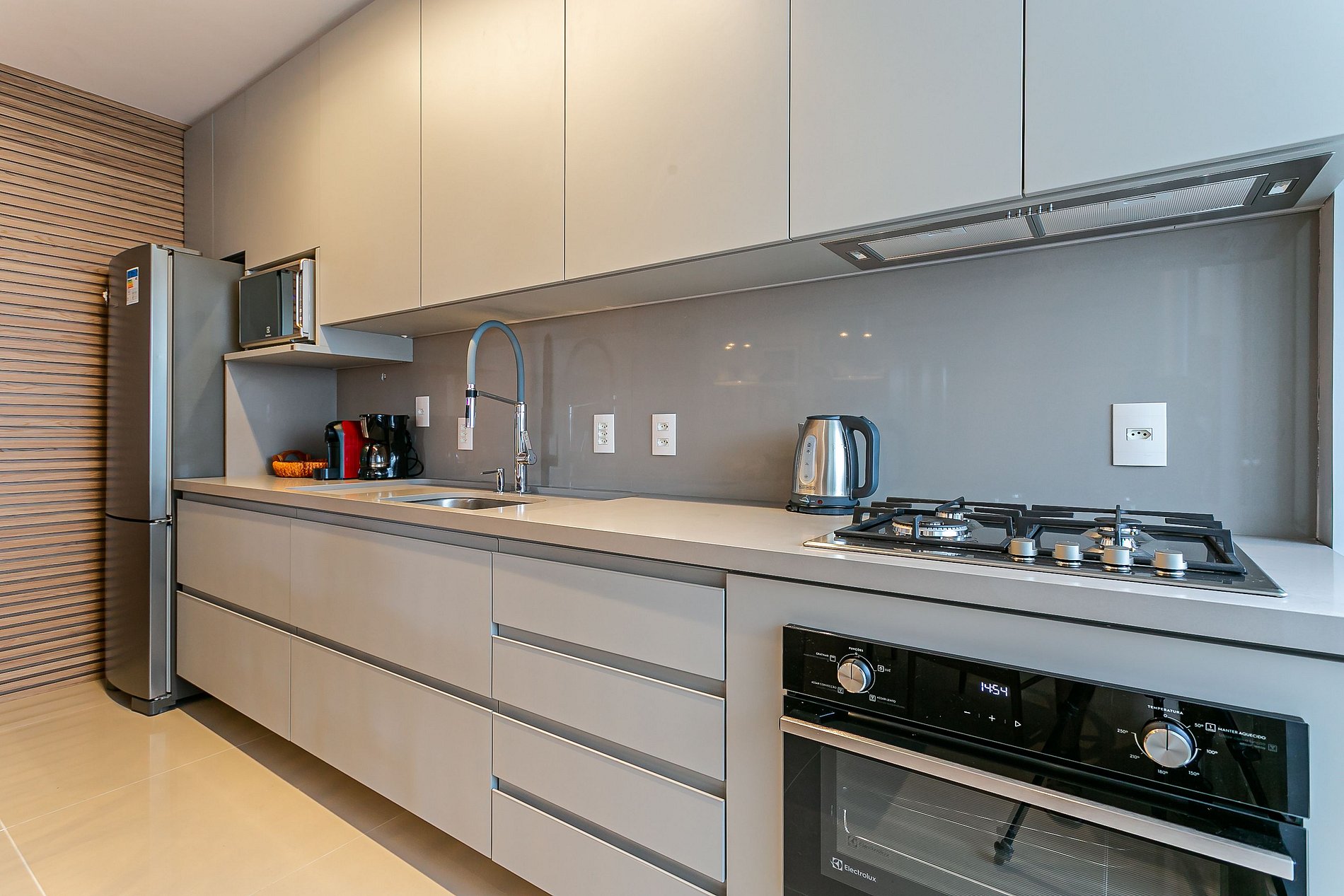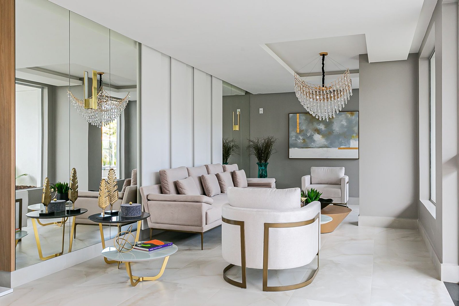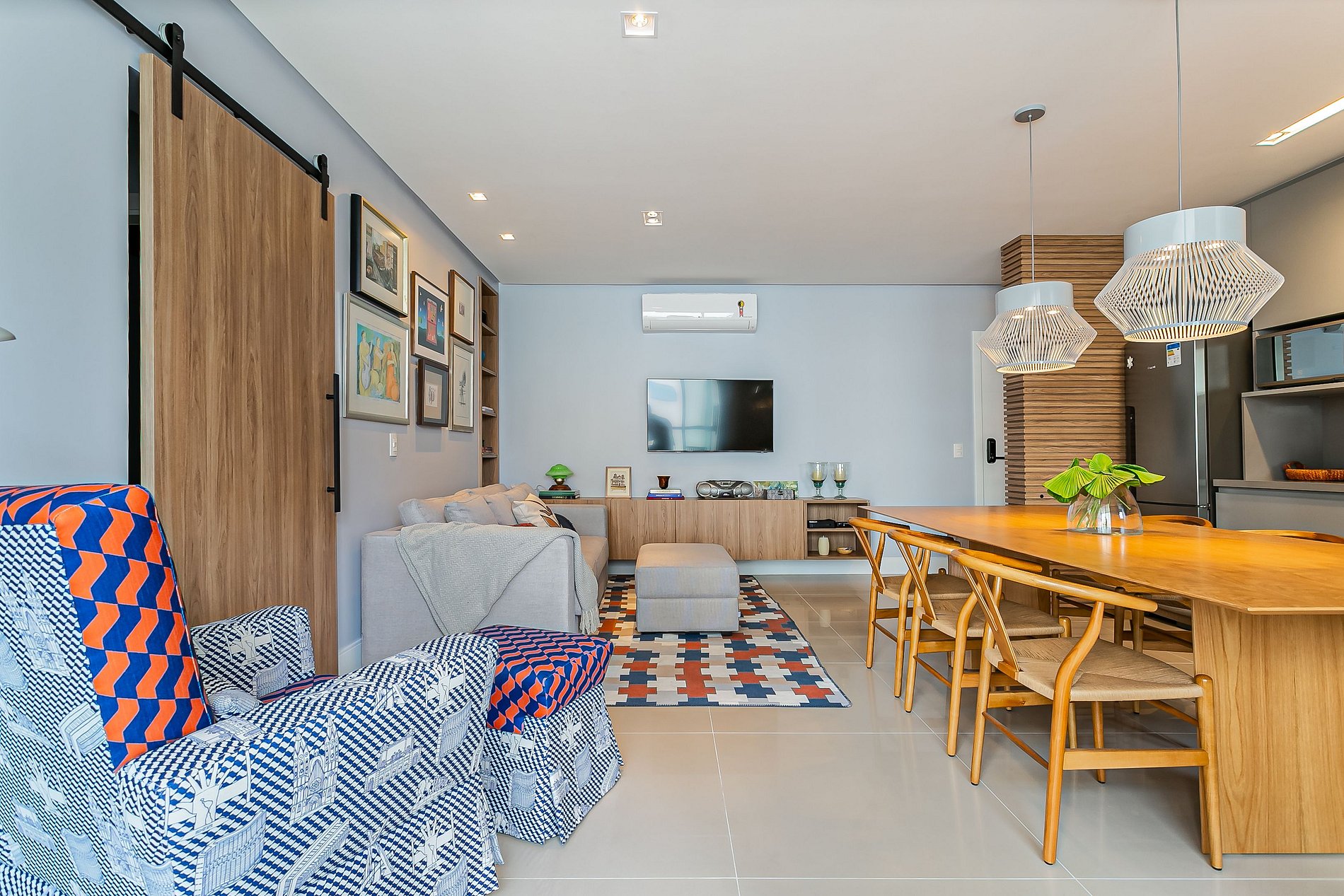 O imóvel de 99m² conta com duas suítes, uma sala de estar com Smart TV e uma sacada com churrasqueira. Todos os cômodos são equipados com Ar-condicionado SPLIT.