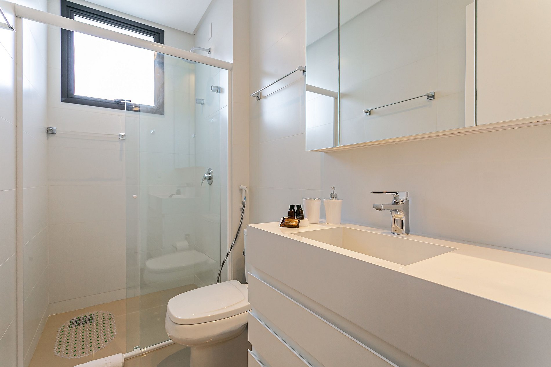 - Todos os banheiros possuem amenities: um shampoo, um condicionador, um sabonete e um rolo de papel higiênico por banheiro.