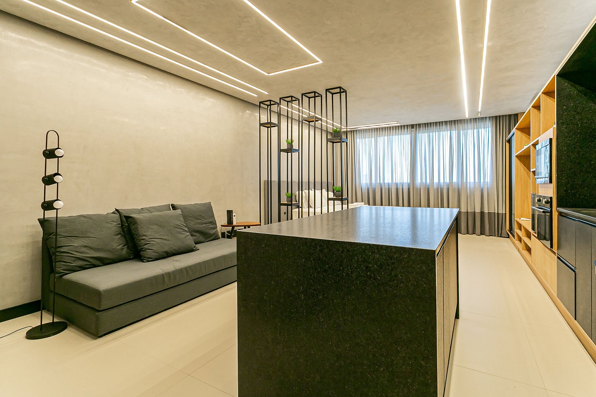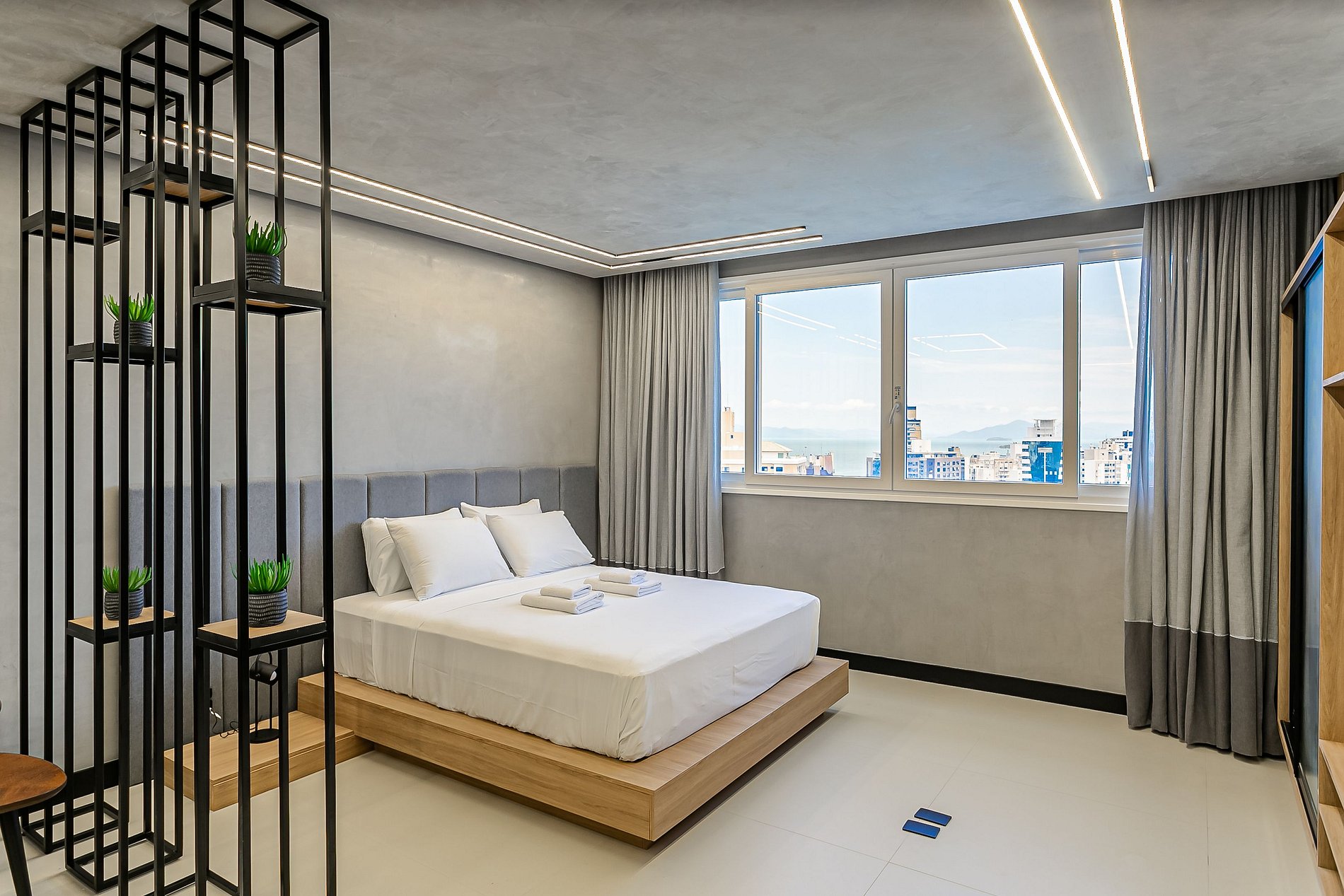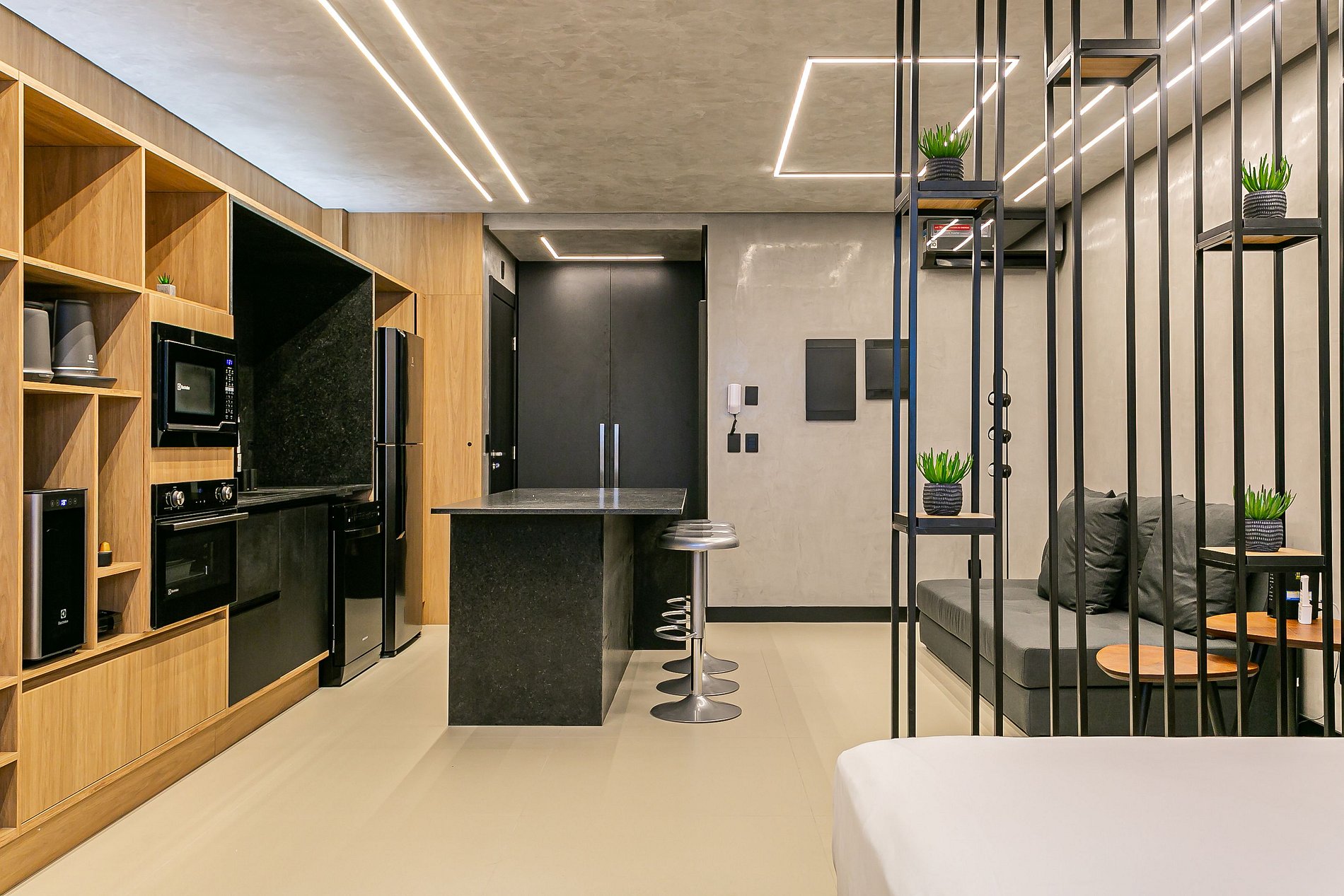 O Stúdio de 46m² conta com Smart TV, Ar-condicionado SPLIT, uma Cama QUEEN e um Sofá-cama de SOLTEIRO.