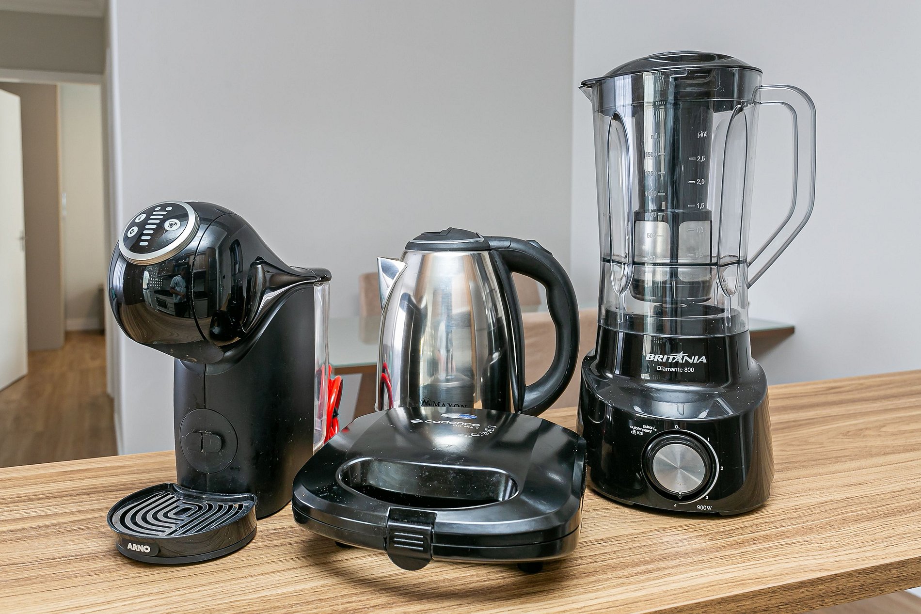 - Cozinha completa com cafeteira, geladeira com congelador, liquidificador, micro-ondas, sanduicheira, utensílios de cozinha e jogo de panelas