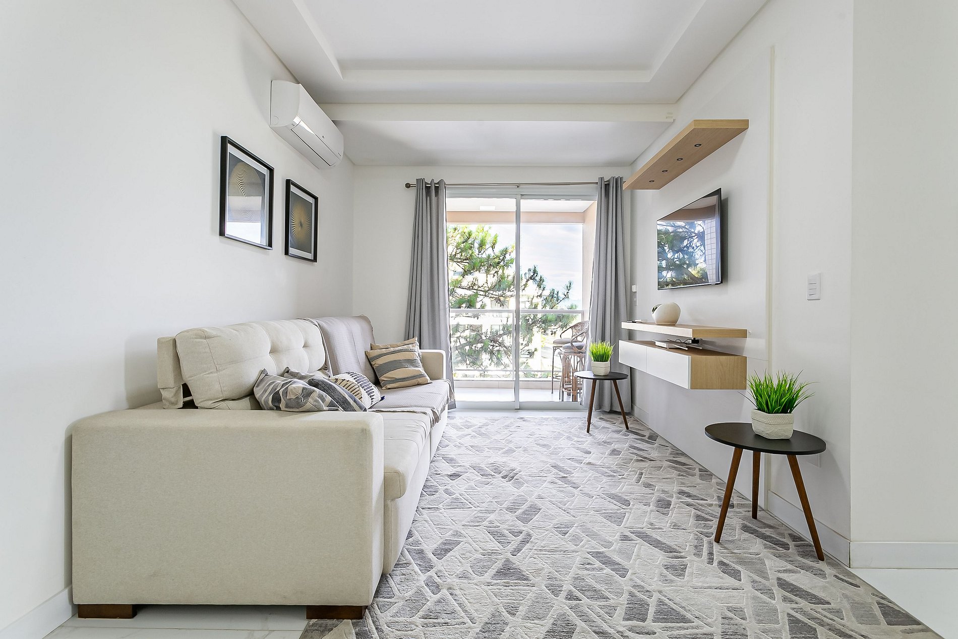 O imóvel de 97,34m² conta com uma suíte com uma CAMA QUEEN, uma suíte com CAMA DE CASAL, uma sala de estar equipada com Smart TV de 40" e uma varanda com churrasqueira. Todas os cômodos contam com AC SPLIT (QUENTE E FRIO).