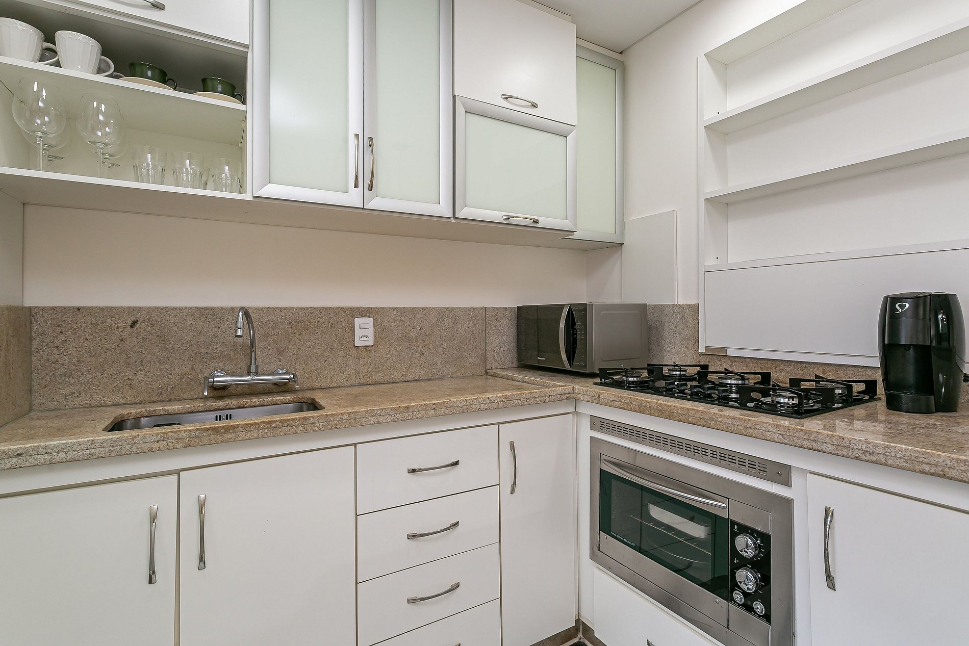 - Cozinha completa com cafeteira, geladeira com congelador, liquidificador, micro-ondas, sanduicheira, utensílios de cozinha e jogo de panelas
