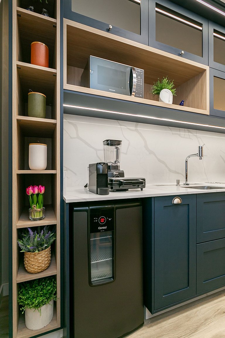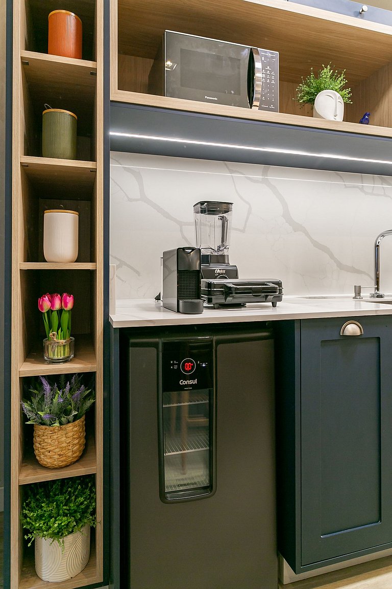 - Cozinha completa com mini adega, cafeteira, geladeira com congelador, liquidificador, micro-ondas, sanduicheira, utensílios de cozinha e jogo de panelas