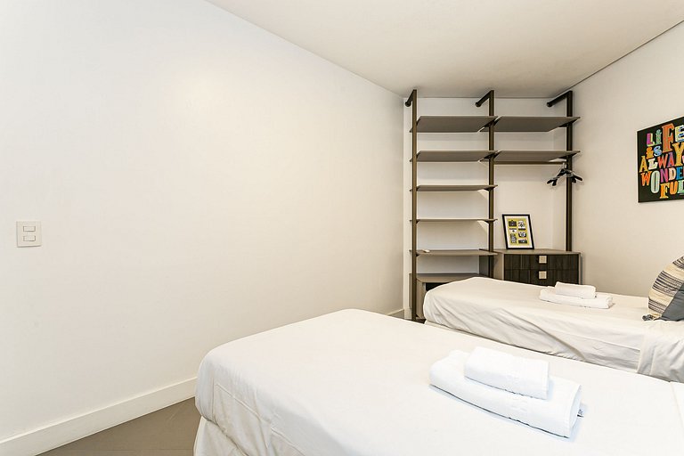 O imóvel de 104m² dispõe de duas suítes, sendo que uma delas conta com uma cama KING e Smart TV enquanto a outra está equipada com duas camas de SOLTEIRO. Todos os cômodos são equipados com Ar-condicionado SPLIT.