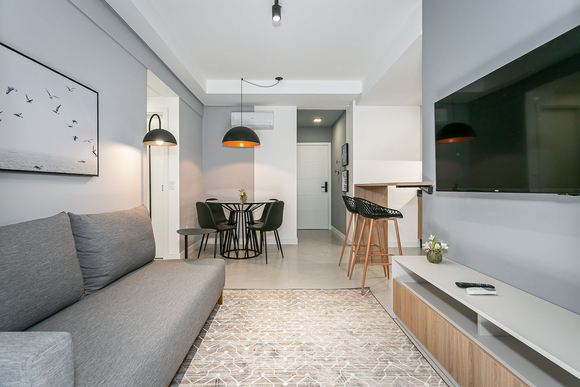 O imóvel de 68m² conta com duas suítes com CAMA DE CASAL, uma sala de estar com SMART TV DE 50" e uma varanda com churrasqueira. Todos os cômodos possuem AC SPLIT.