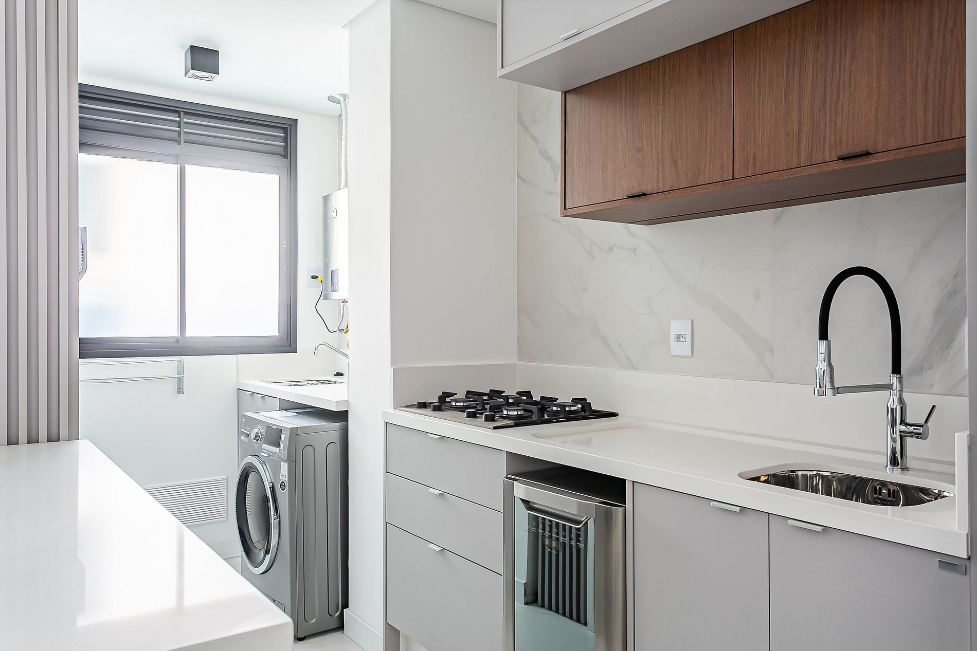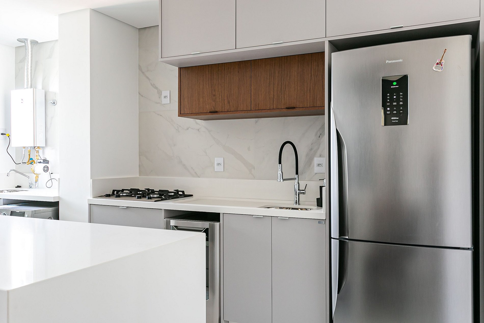 - Cozinha completa com air fryer, cafeteira, geladeira com congelador, liquidificador, micro-ondas, sanduicheira, utensílios de cozinha e jogo de panelas