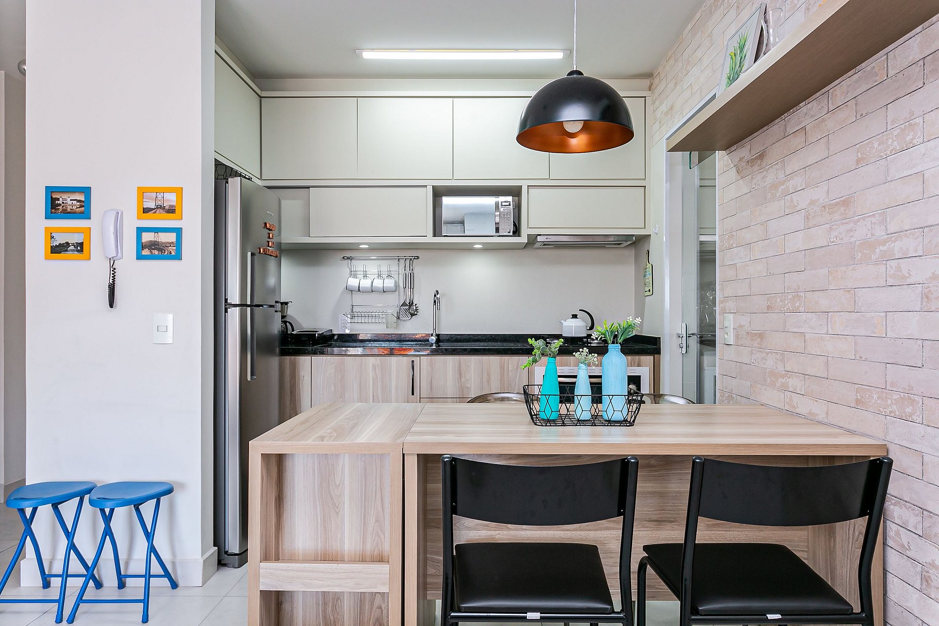 - Cozinha completa com cafeteira, geladeira com congelador, liquidificador, micro-ondas, sanduicheira, utensílios de cozinha e jogo de panelas