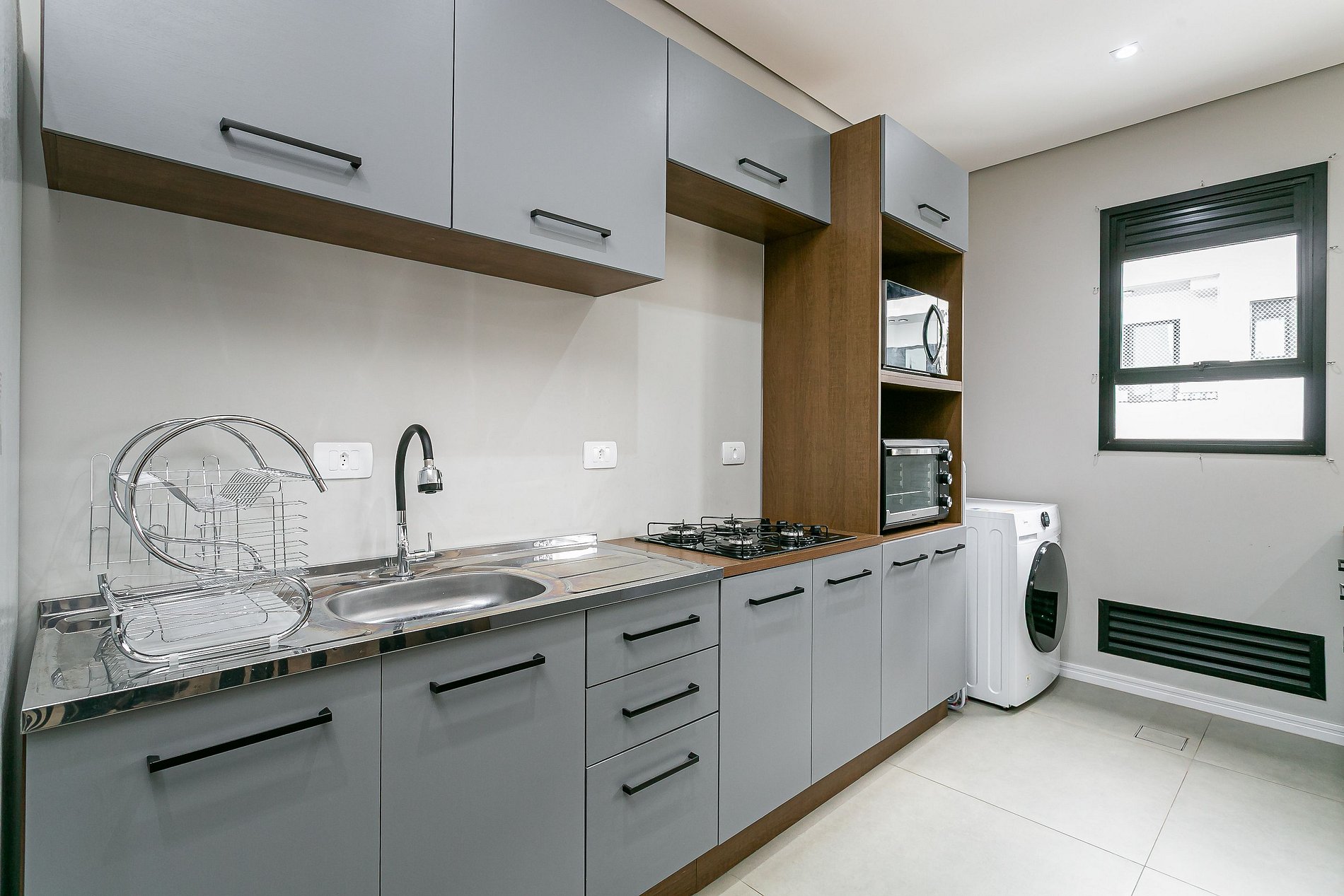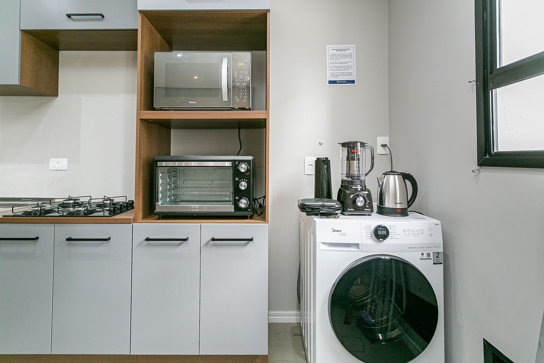 - Cozinha completa com cafeteira, geladeira com congelador, liquidificador, micro-ondas, sanduicheira, utensílios de cozinha e jogo de panelas