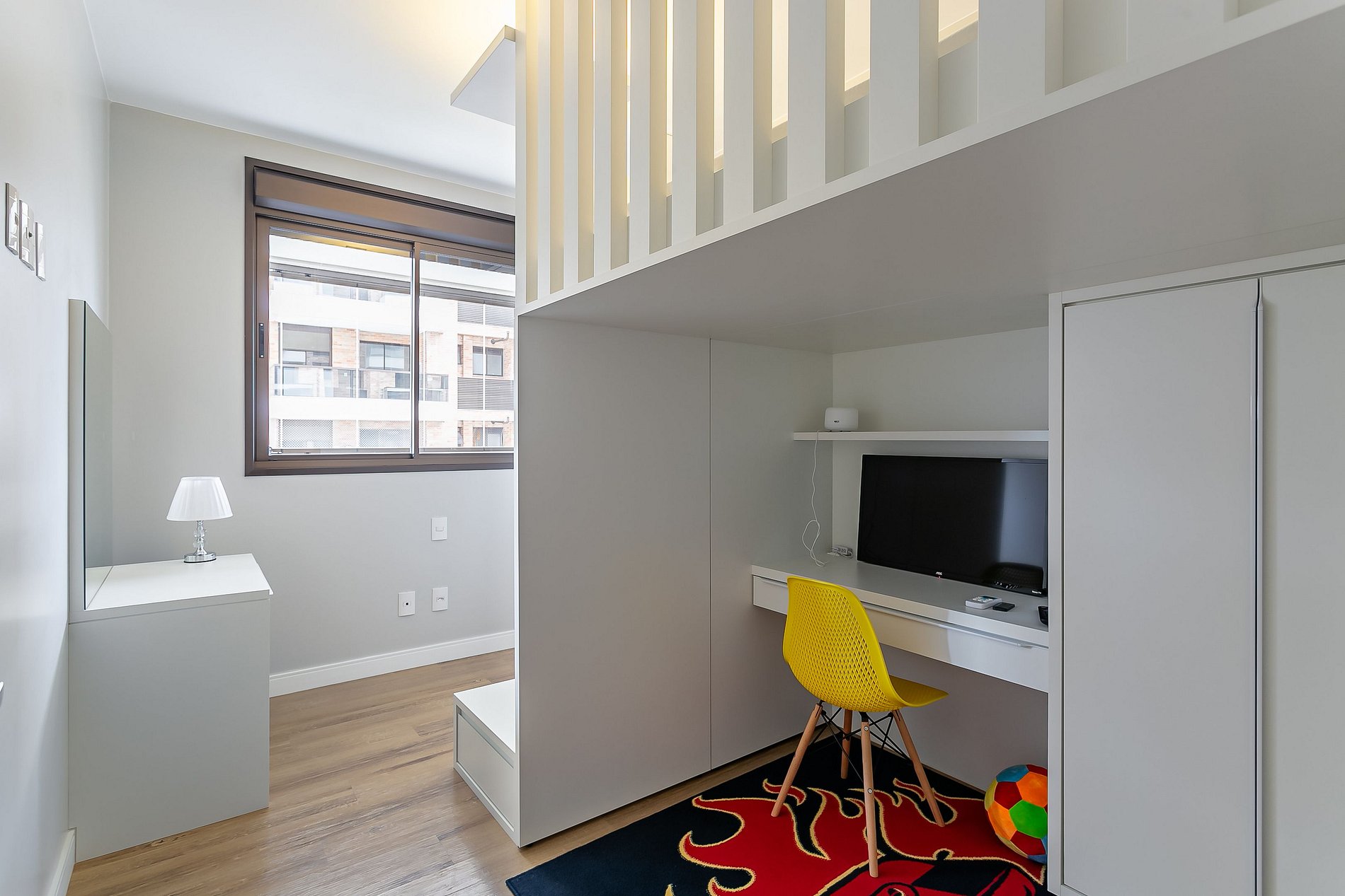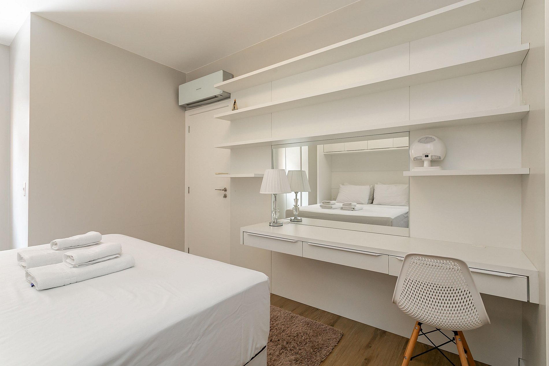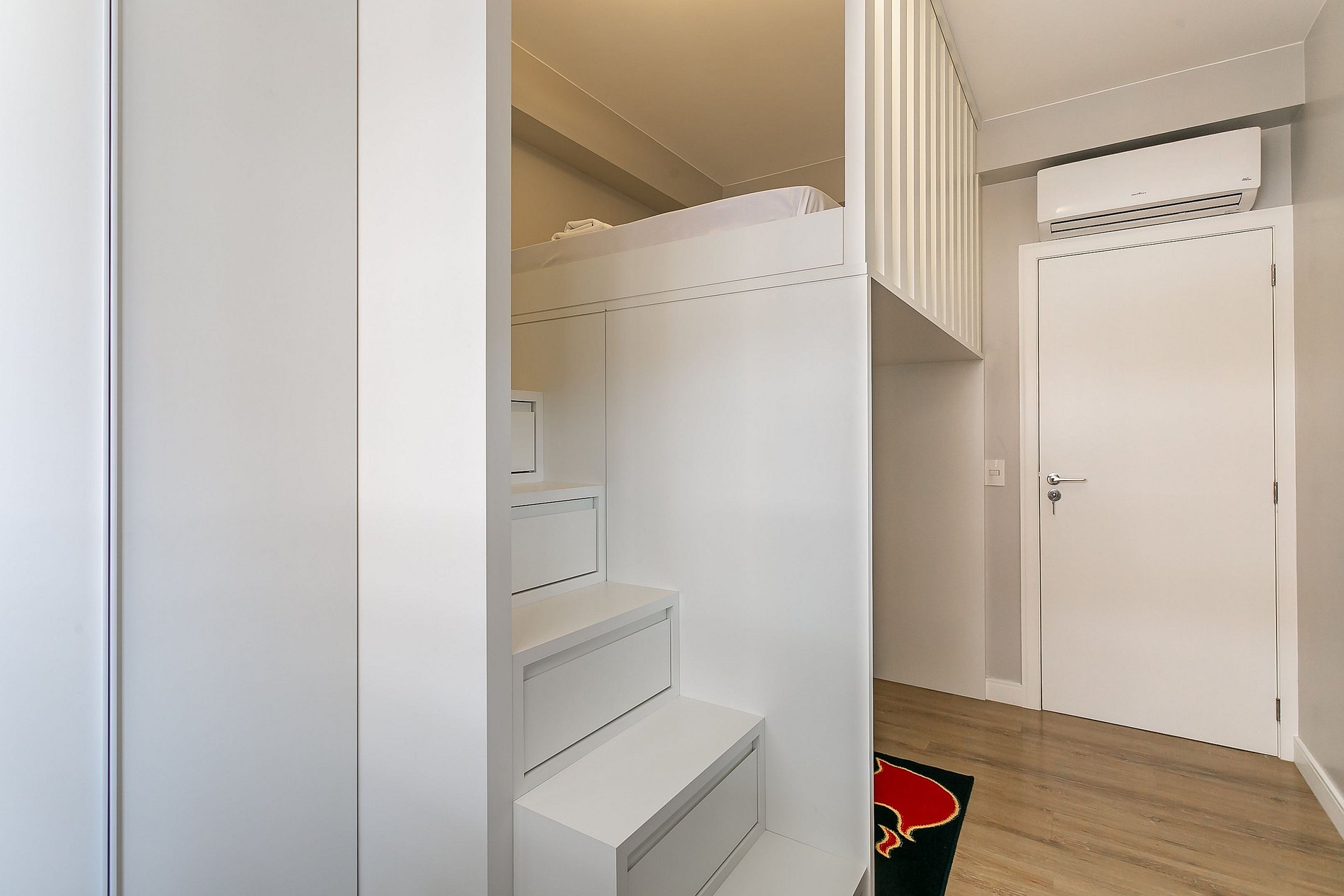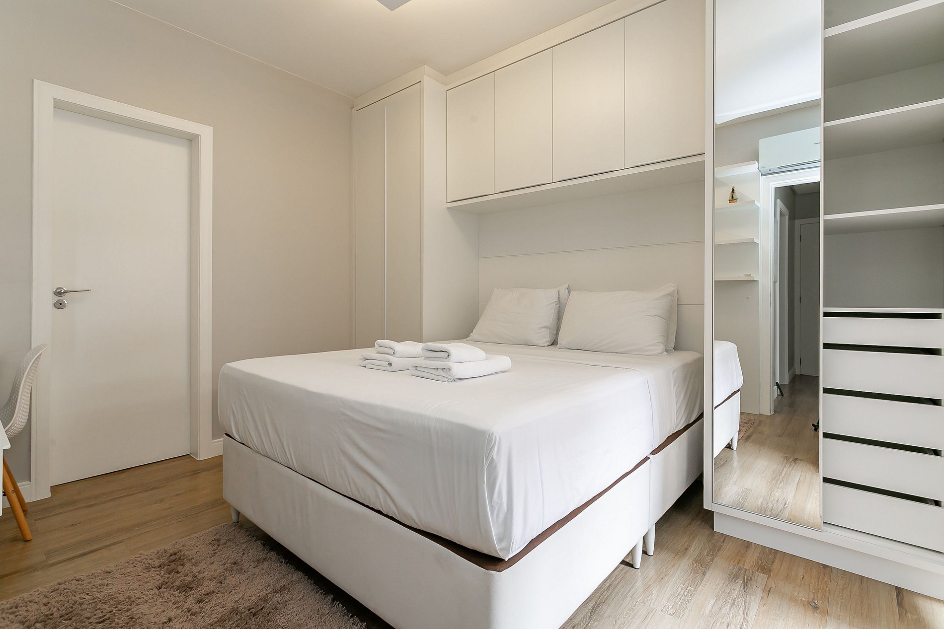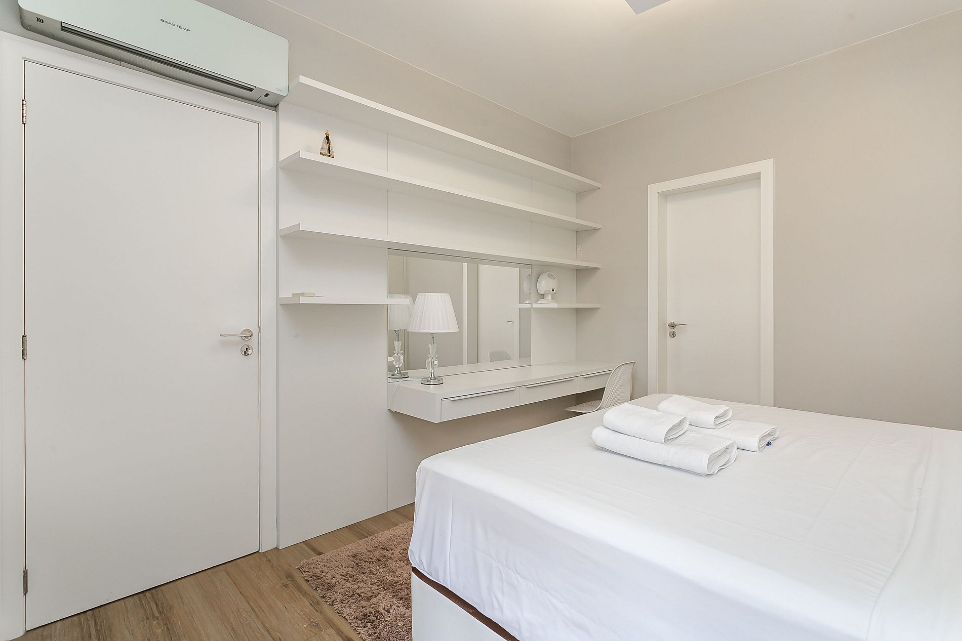 O apartamento de 127m² conta com uma suíte com cama KING, um quarto com cama de CASAL e um quarto com uma cama de VIÚVA suspensa (para 1 pessoa), além de uma sala de estar com Smart TV. Todos os cômodos são equipados com Ar-condicionado SPLIT.
