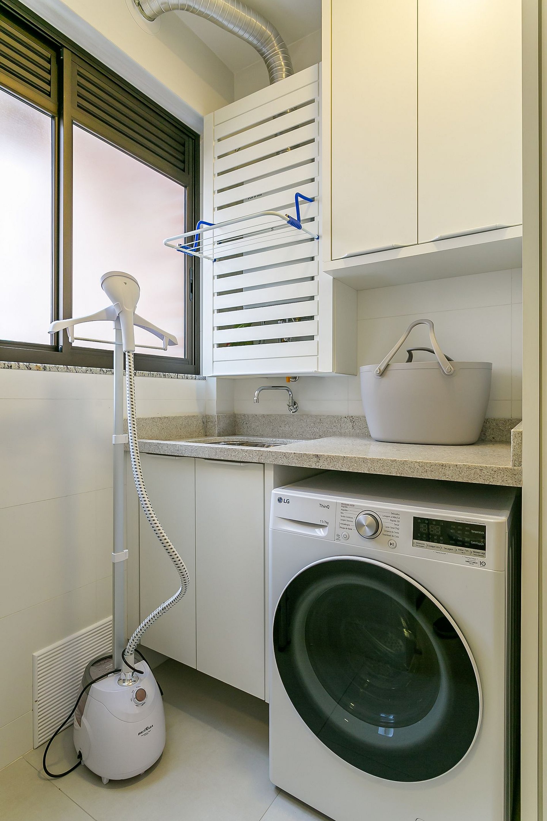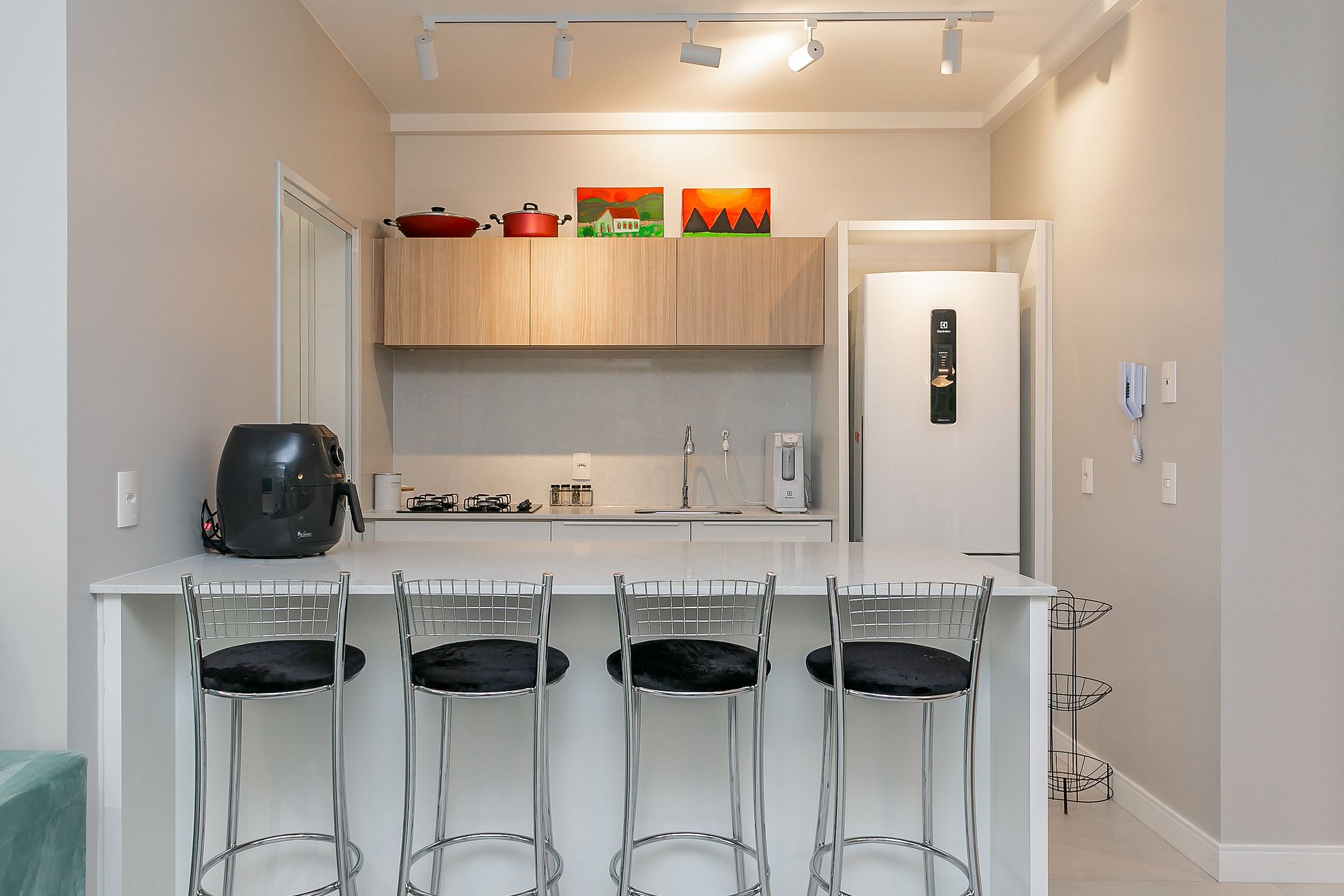 - Cozinha completa com air fryer, cafeteira, geladeira com congelador, liquidificador, micro-ondas, sanduicheira, utensílios de cozinha e jogo de panelas