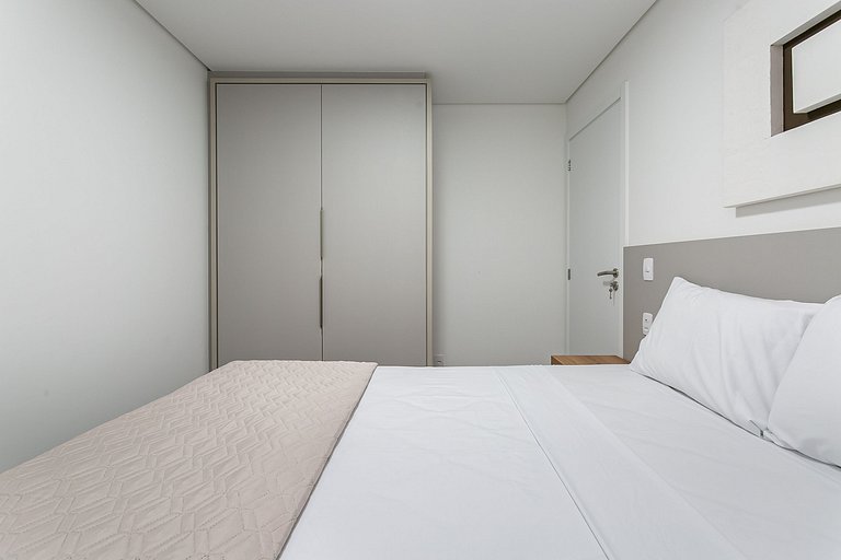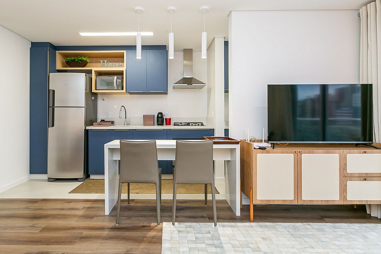 O imóvel de 69m² conta com uma suíte com cama QUEEN, um quarto com cama QUEEN, uma sala de estar equipada com uma Smart TV de 50" e uma Sacada com Churrasqueira. Todos os cômodos são equipados com Ar-condicionado SPLIT
