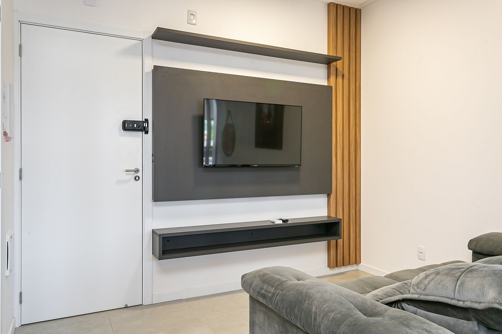 O studio de 34m² conta com uma cama QUEEN, uma Smart TV de 43" e AC SPLIT (SÓ FRIO).