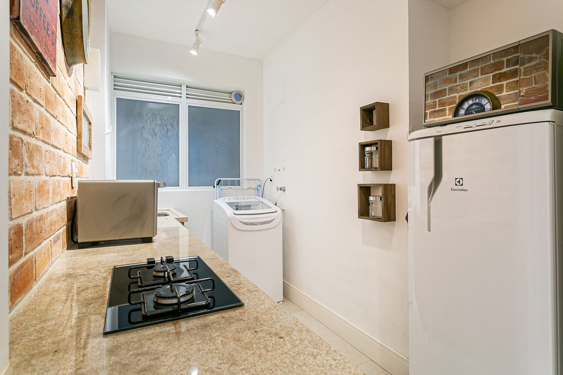 - Cozinha completa com cafeteira, geladeira com congelador, liquidificador, micro-ondas, sanduicheira, utensílios de cozinha e jogo de panelas