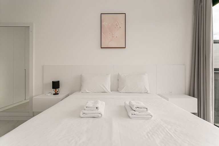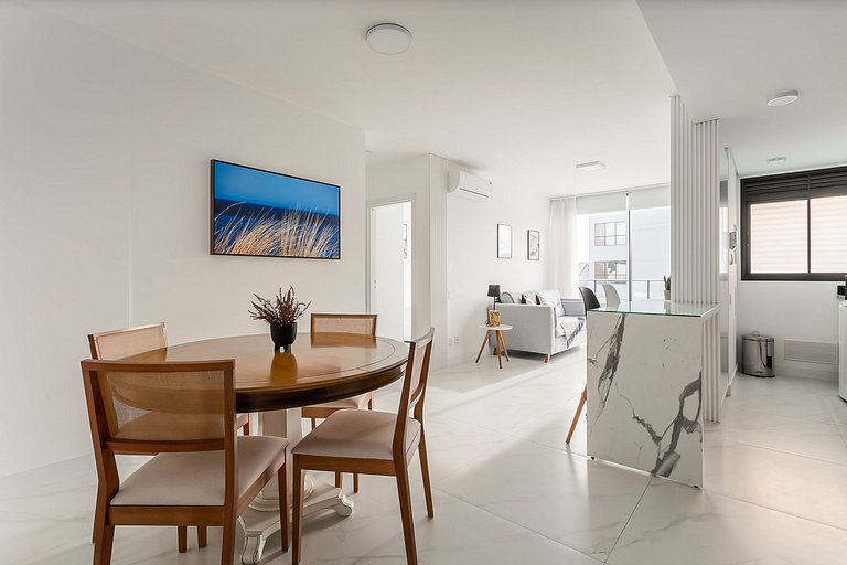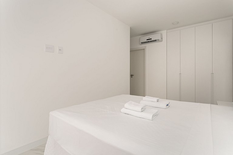 O imóvel de 104m² conta com uma suíte com uma cama QUEEN, um quarto com uma cama QUEEN, uma sala muito aconchegante com Smart TV e uma varanda ampla. Todos os cômodos são equipados com Ar-condicionado SPLIT.
