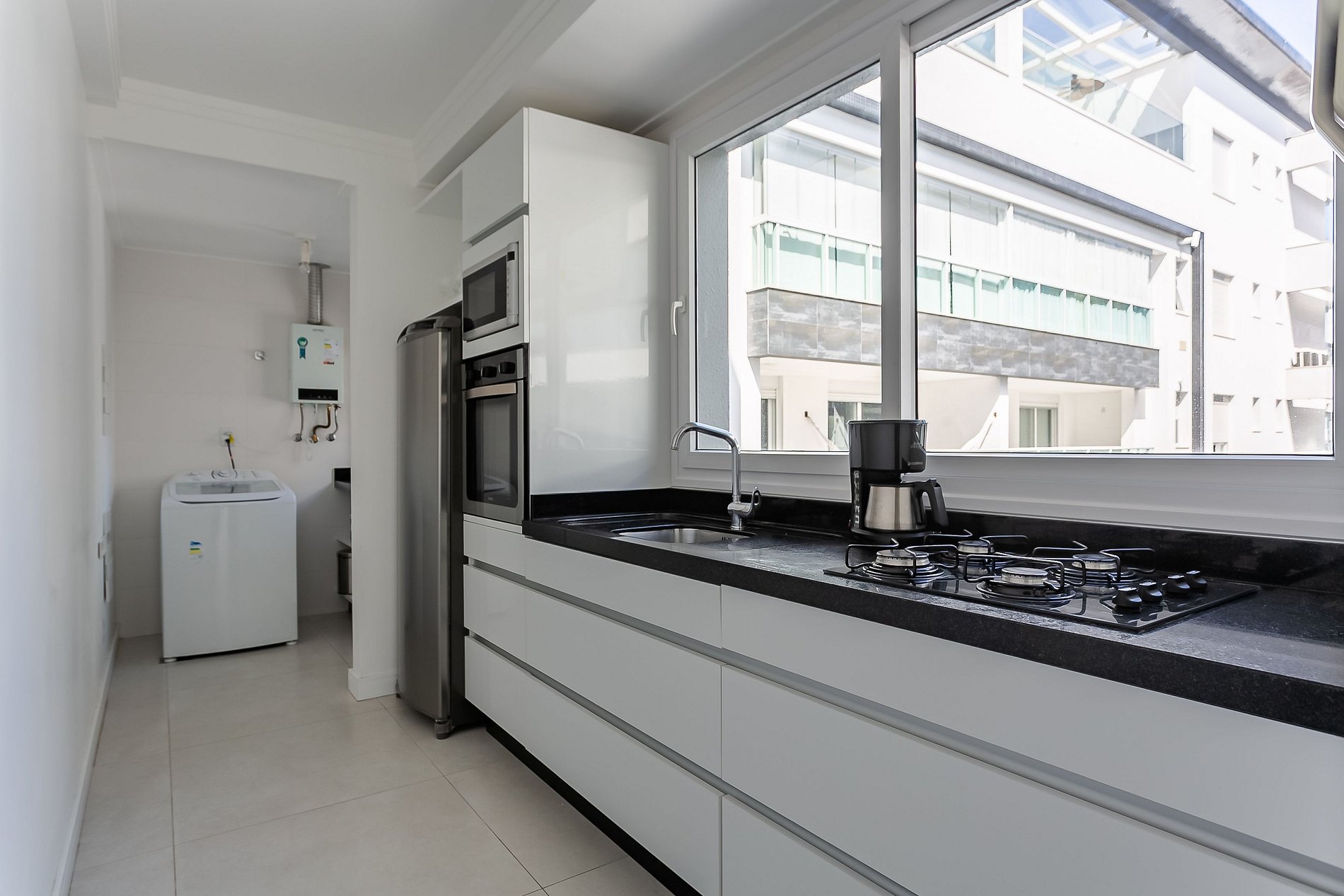 - Cozinha completa com cafeteira, geladeira com congelador, liquidificador, micro-ondas, sanduicheira, utensílios de cozinha e jogo de panelas