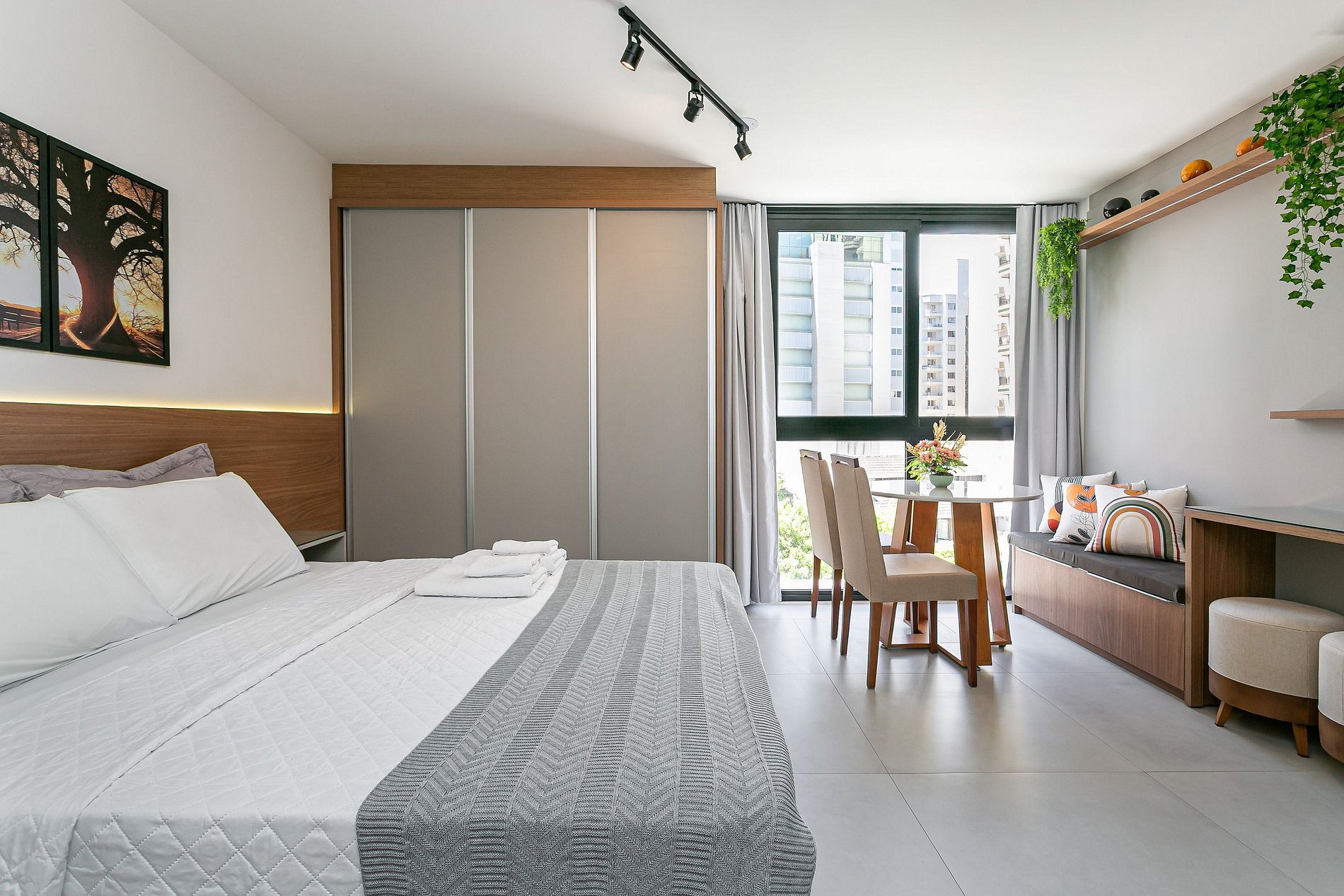 O imóvel de 32m² conta com uma CAMA QUEEN, SMART TV DE 55" E AC SPLIT (QUENTE E FRIO).